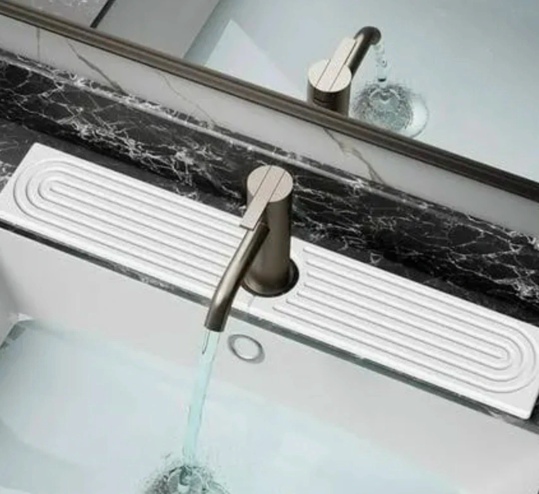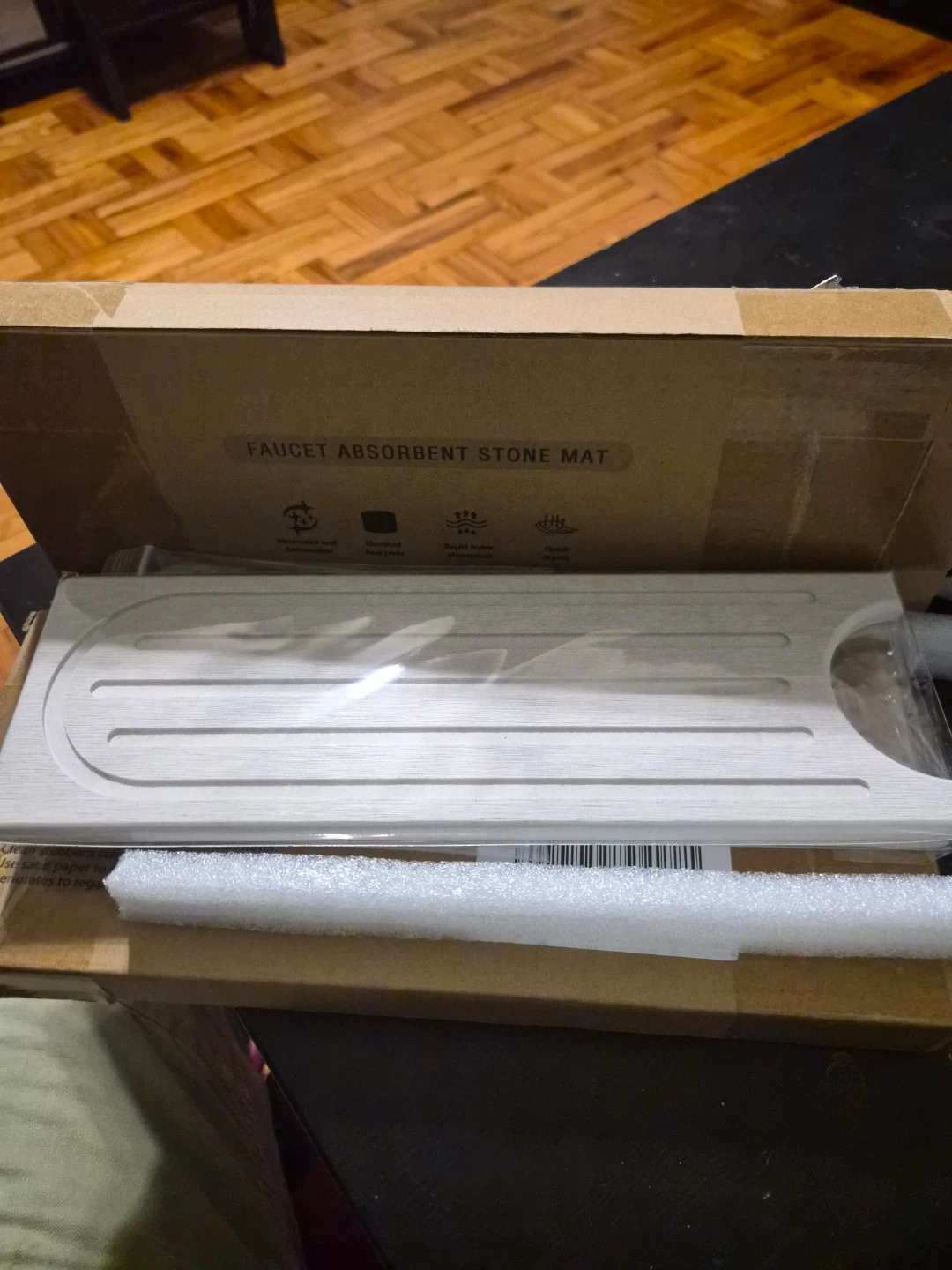 Selling a faucet absorbent stone mat in white gray. It's designed to be quick drying and helps keep your countertop clean and dry. Comes with the original box