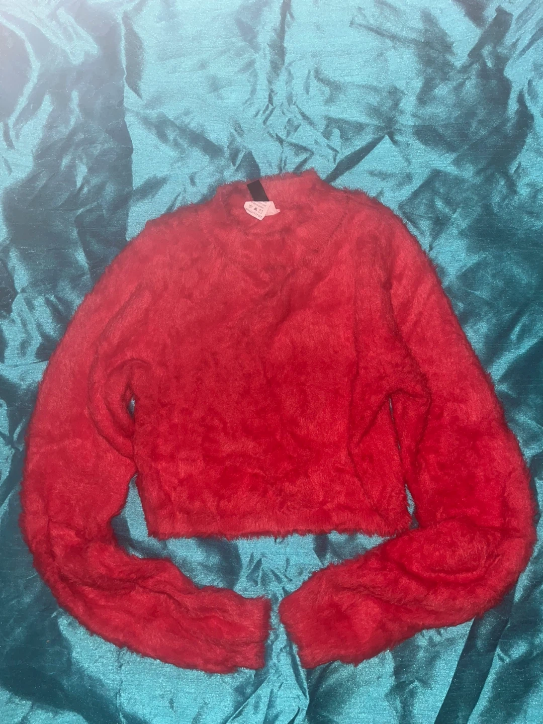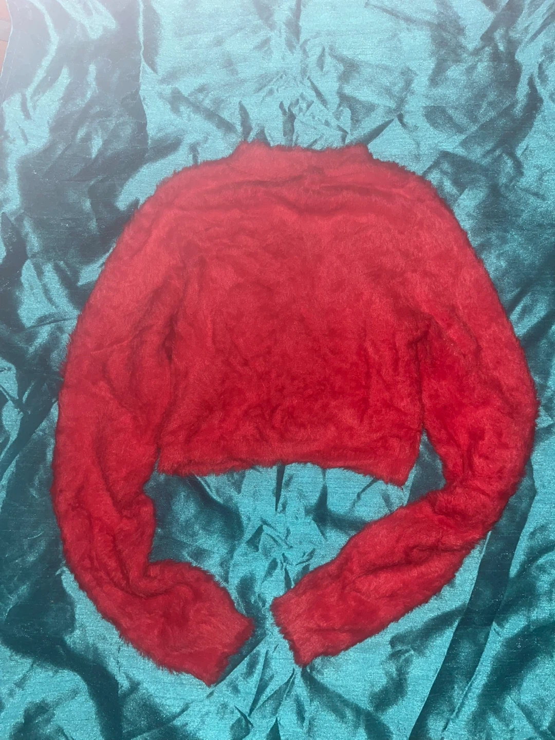 Here's a cute red fuzzy cropped sweater! It's perfect for adding a pop of color and texture to your outfit. The material is soft and cozy, making it ideal for cooler weather. It's in great condition and ready for a new owner