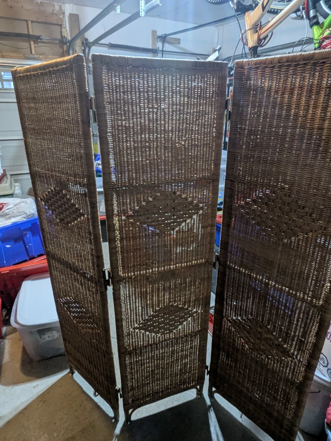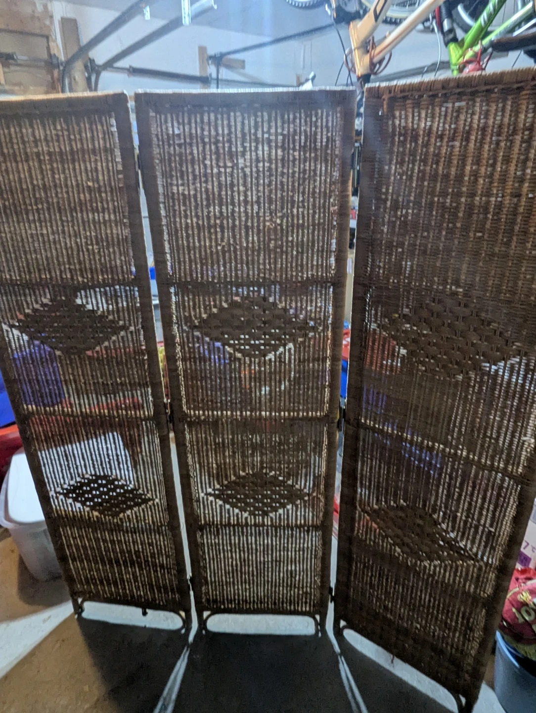 I'm selling a wicker room divider! It's in great shape and would be perfect for adding some privacy or dividing a space in your home. It has a nice woven pattern and a warm, natural look that would complement any decor