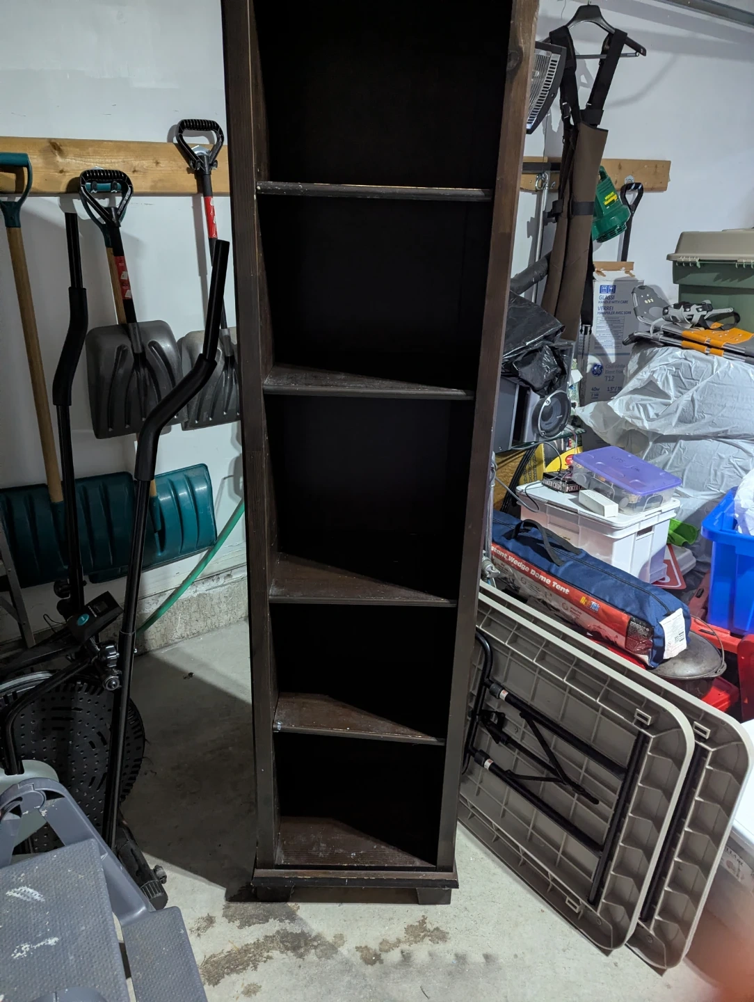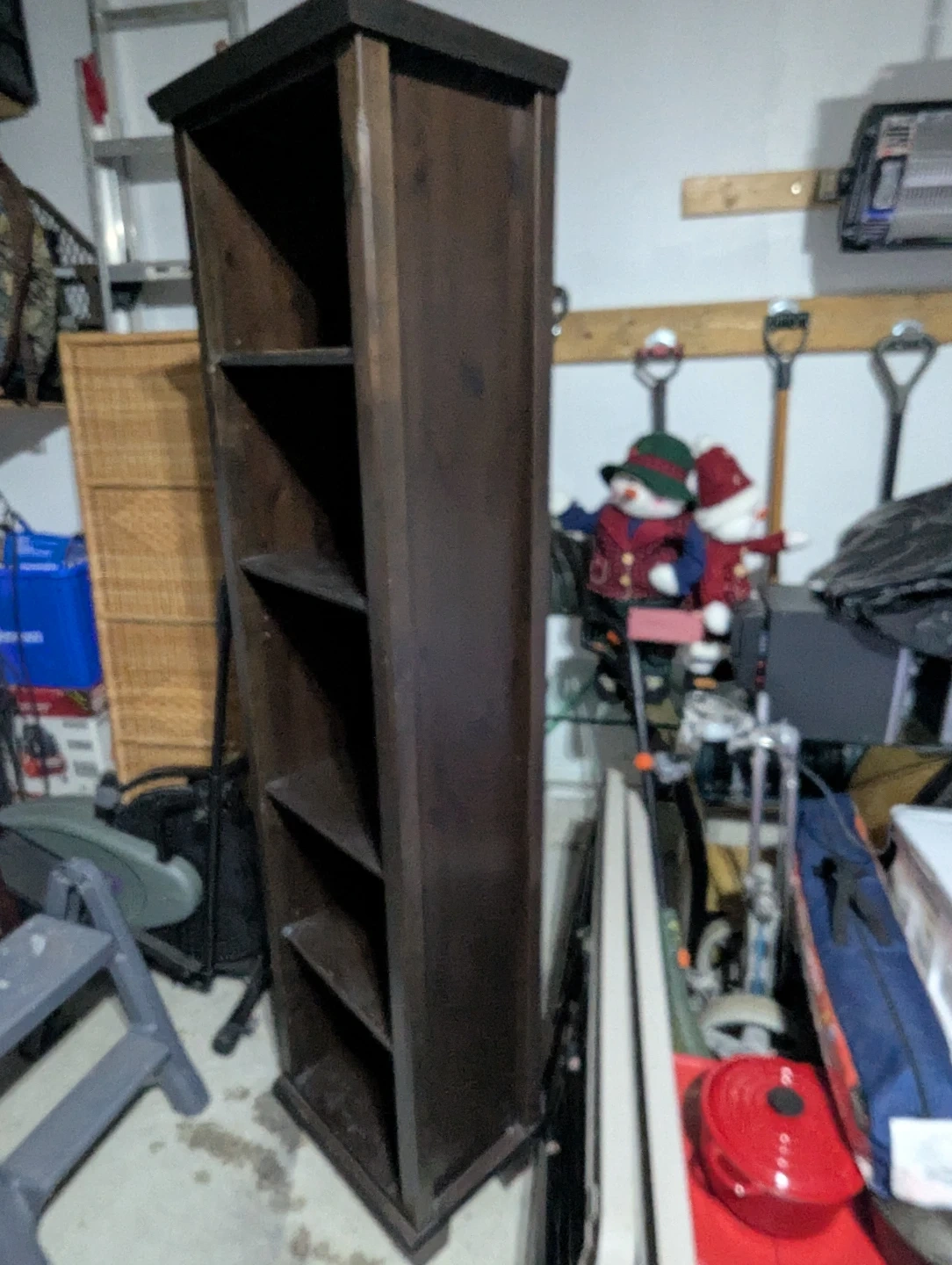 Here's a tall wooden bookcase, perfect for storing your books or displaying your favourite items. It's a nice dark brown colour, and would look great in any room of the house. It's in good condition, ready to be used!