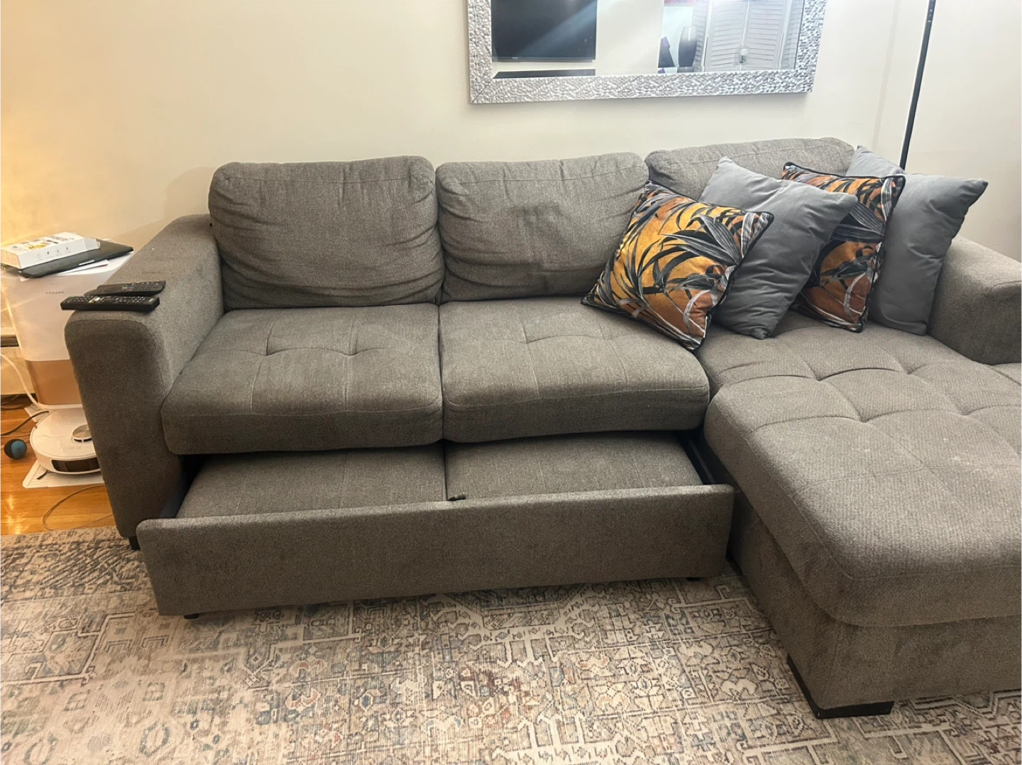 Selling a comfortable grey sectional sofa. It features a convenient pull-out bed, perfect for guests or extra lounging space. The sectional is in good condition and ready for a new home!