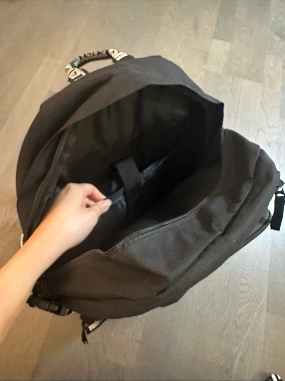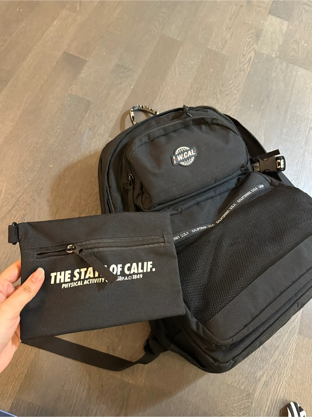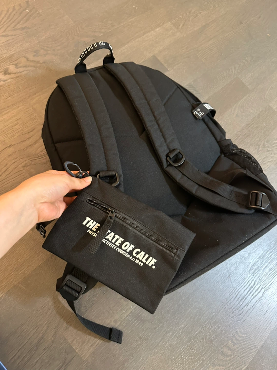 It comes with a detachable pouch that says "The State of Calif." The backpack has multiple compartments and is in great condition!