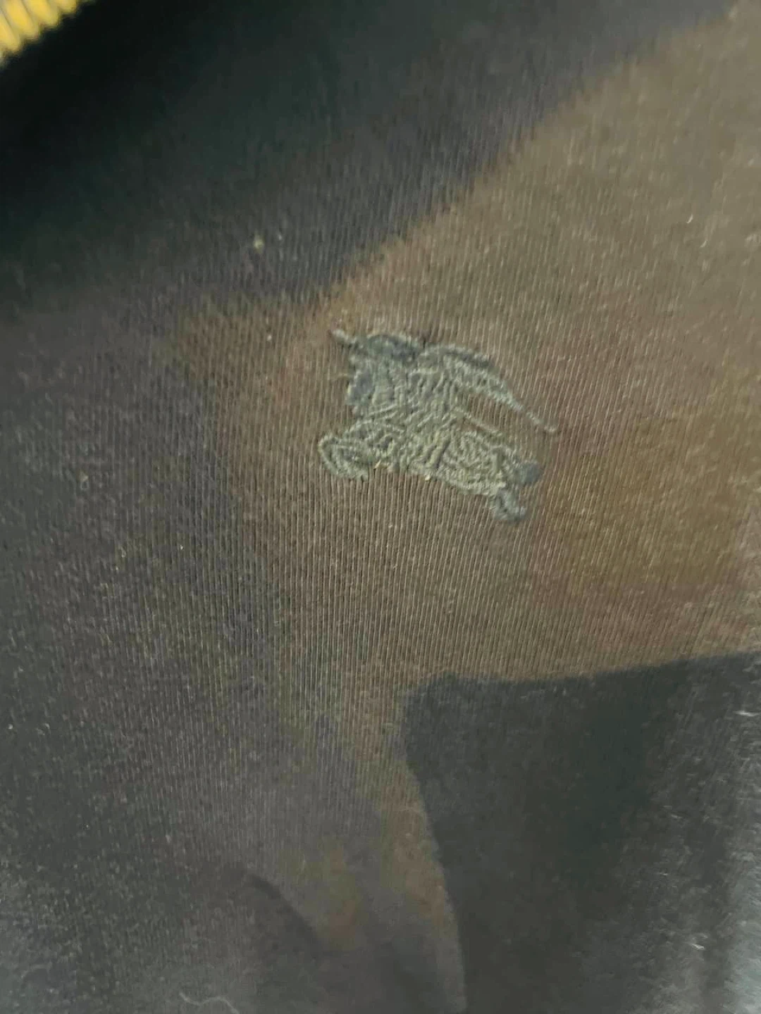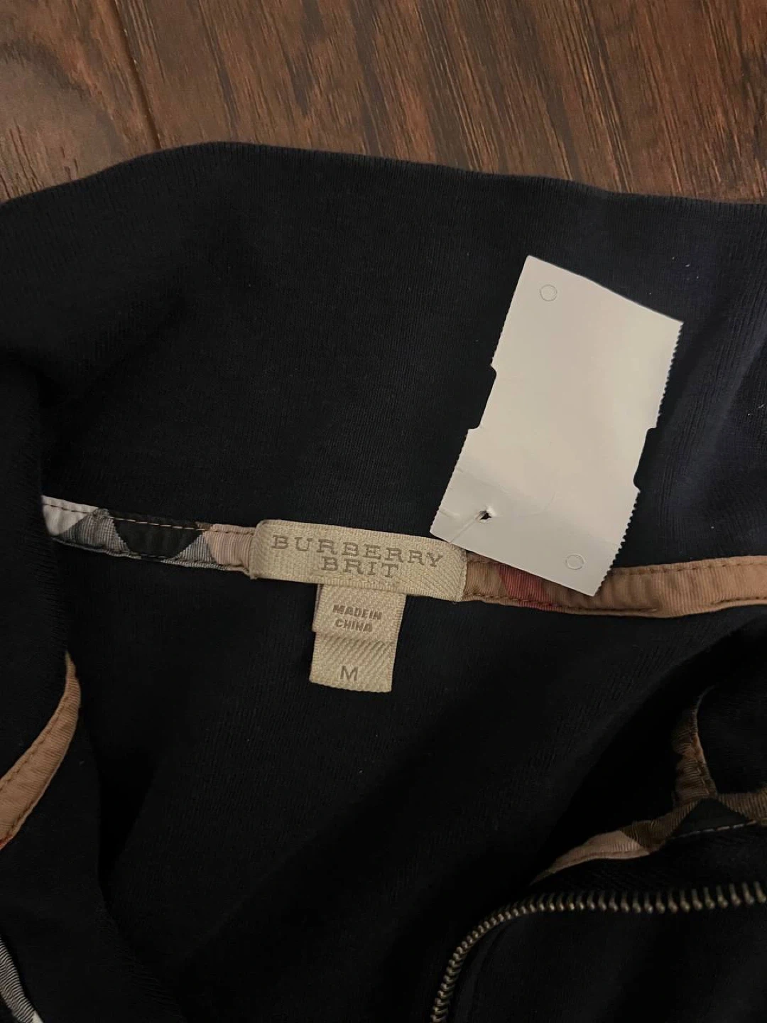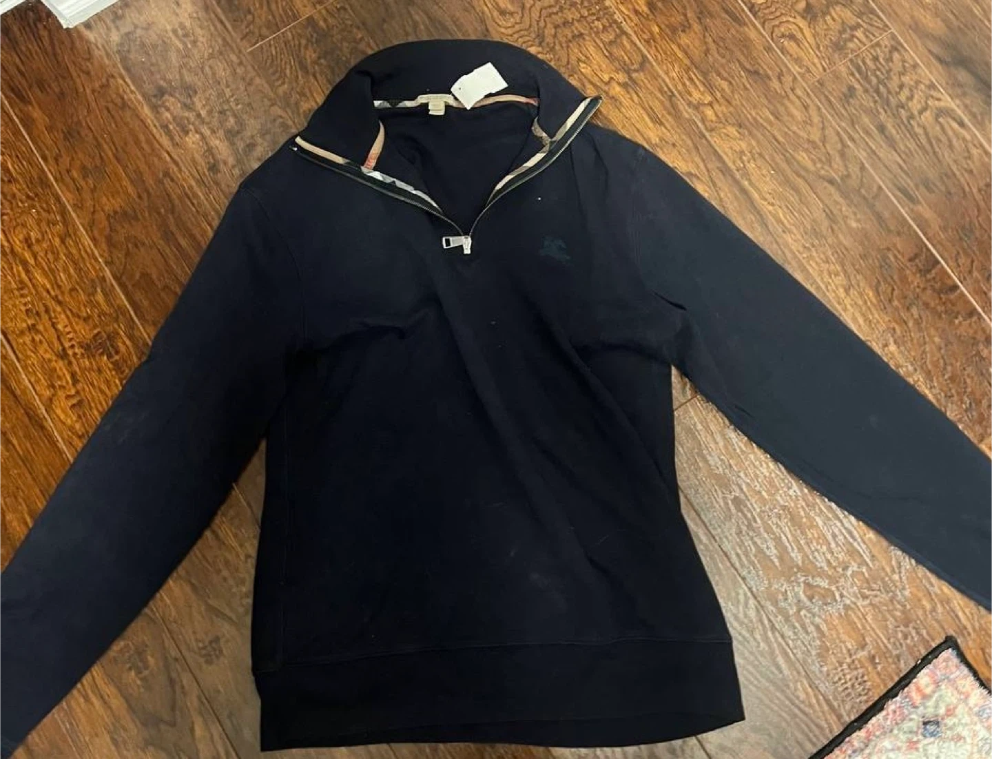 Selling a gently used Burberry Brit quarter-zip pullover in size medium. It's a stylish and comfortable piece, perfect for layering. The classic Burberry check pattern accents the collar, adding a touch of sophistication to the navy blue colour. A subtle Burberry logo is embroidered on the chest. Made in China.