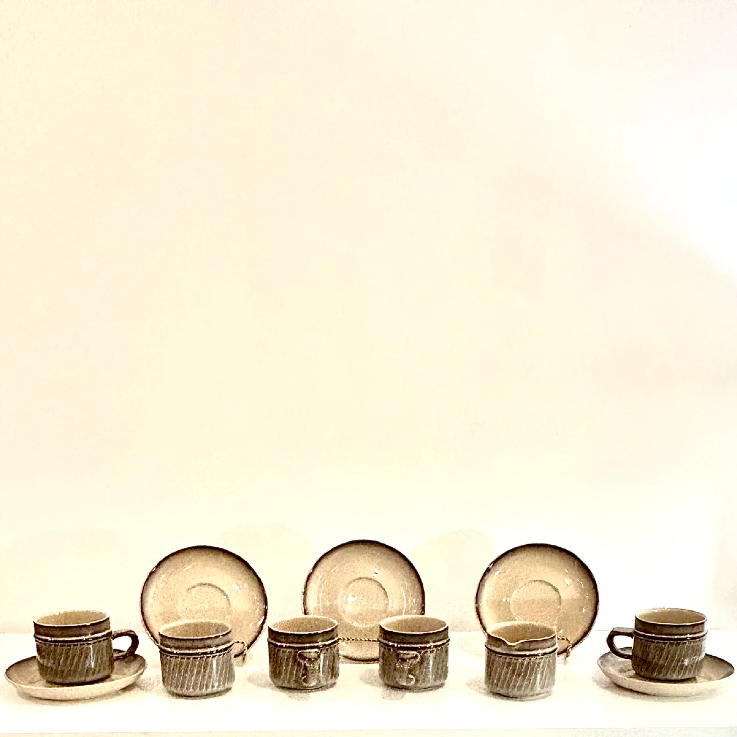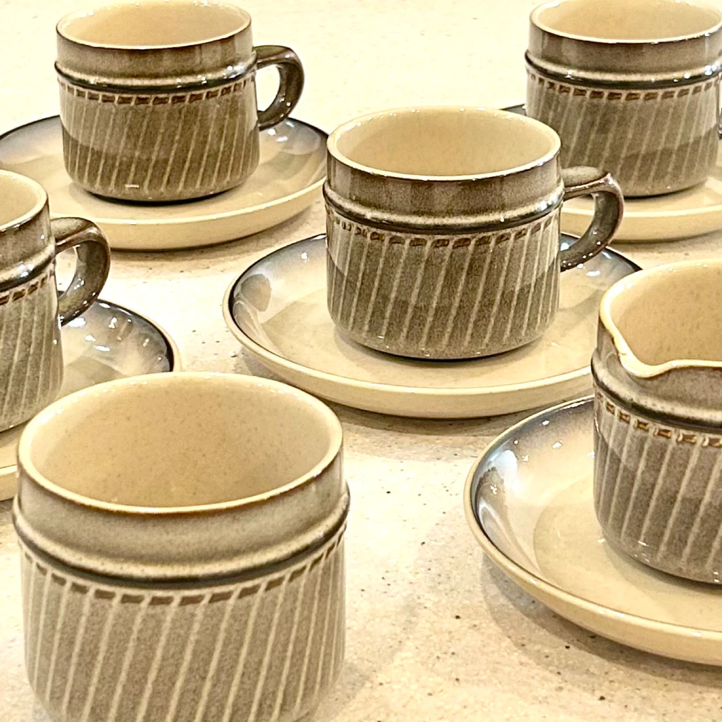 Offered is an authentic vintage Denby stoneware coffee service, produced in Denby, Derbyshire, England, during the mid-20th century, a period when Denby was at the height of its transition into designer-led studio stoneware influenced by modernist and Scandinavian ceramics.