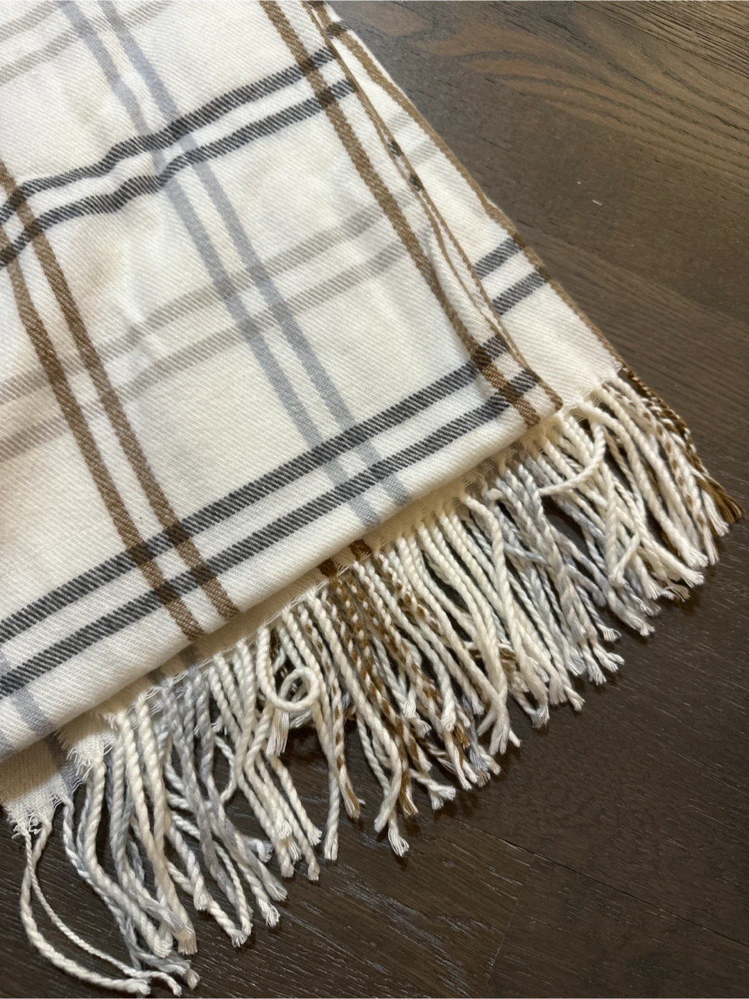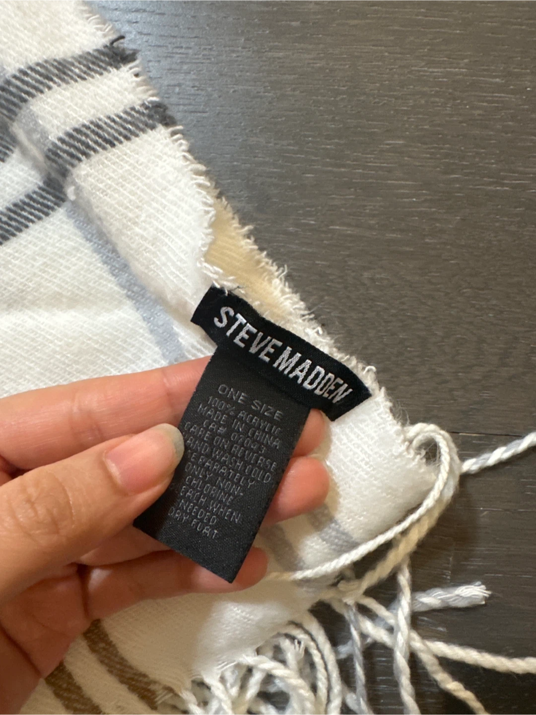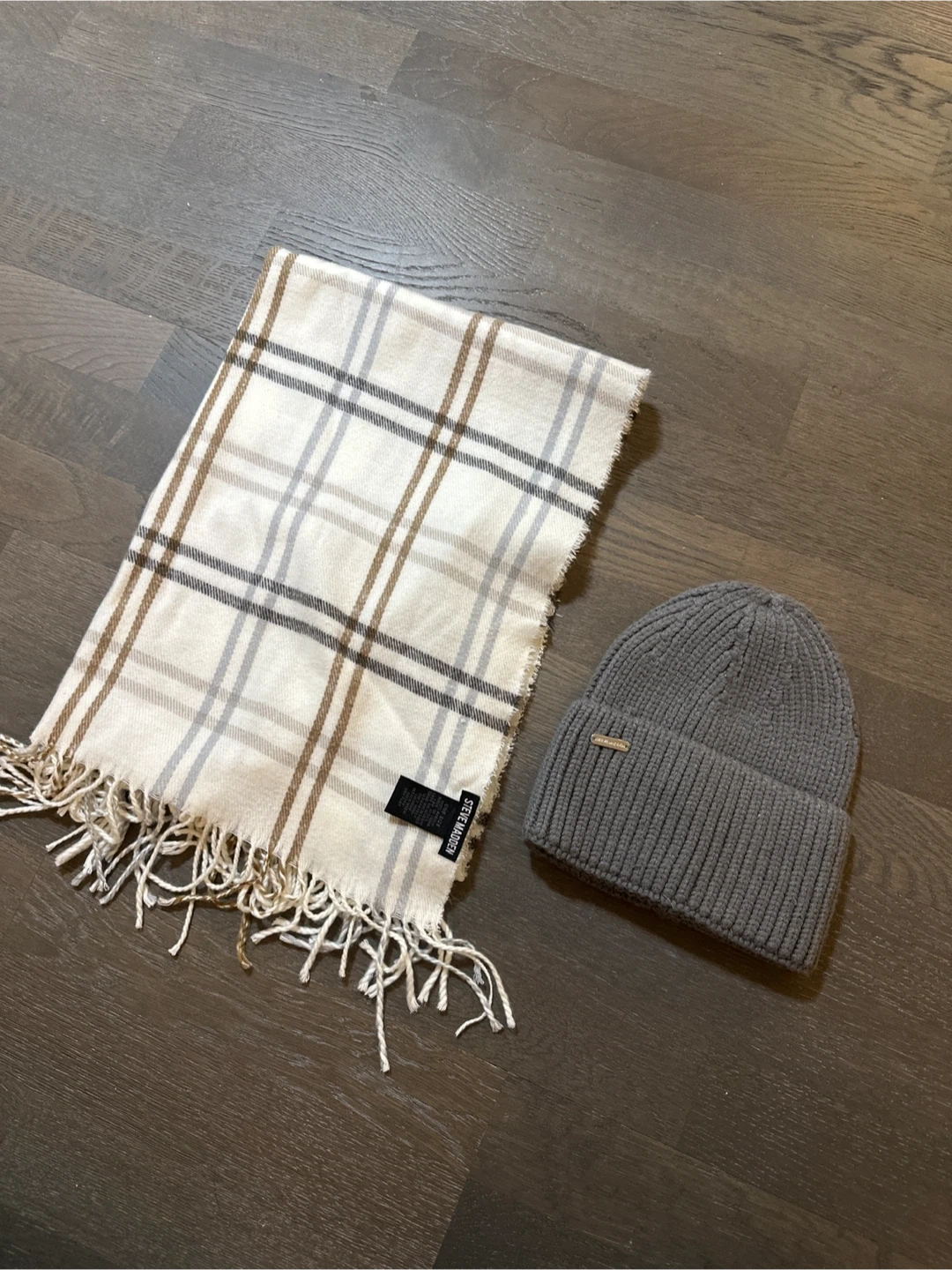 Selling a Steve Madden beanie and scarf set. The beanie is a gray color and the scarf is white with a plaid pattern. Both are in great condition and ready for a new owner!