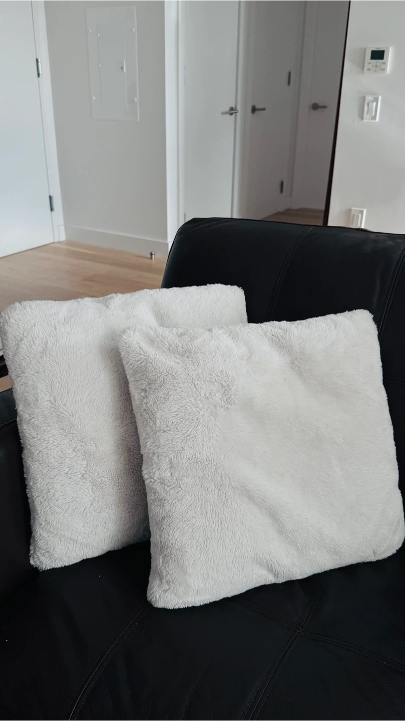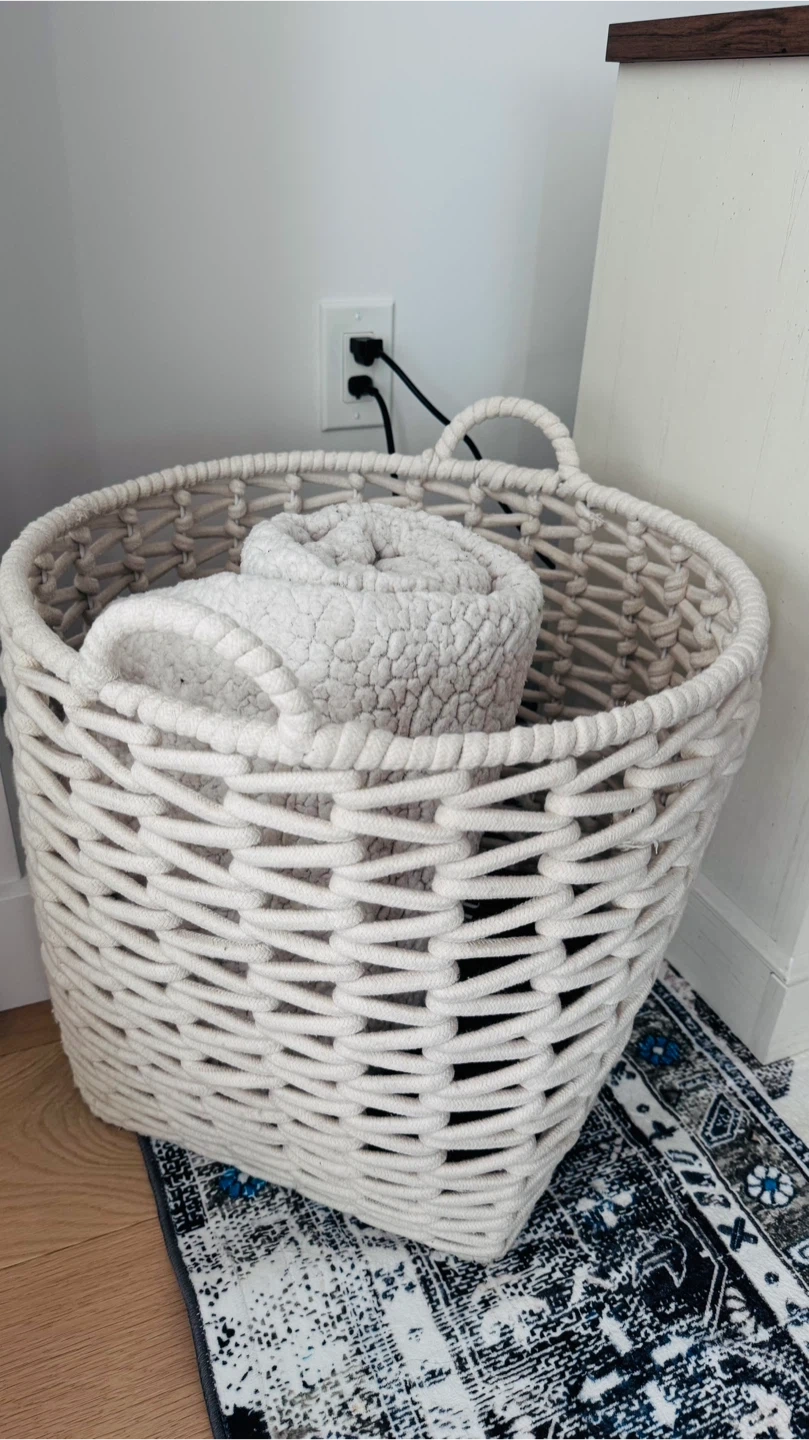BUNDLE. Selling a white woven basket and 2 fuzzy pillows. It's in great condition