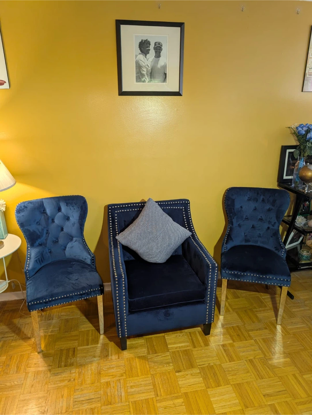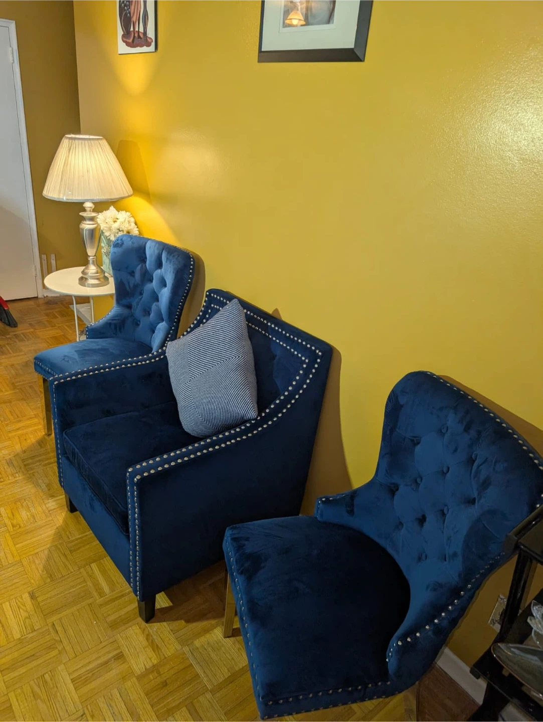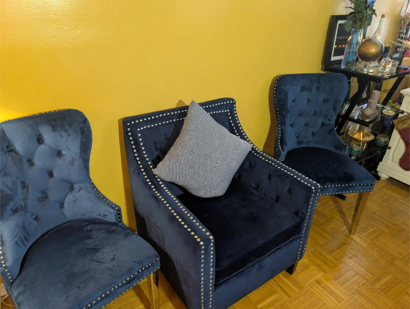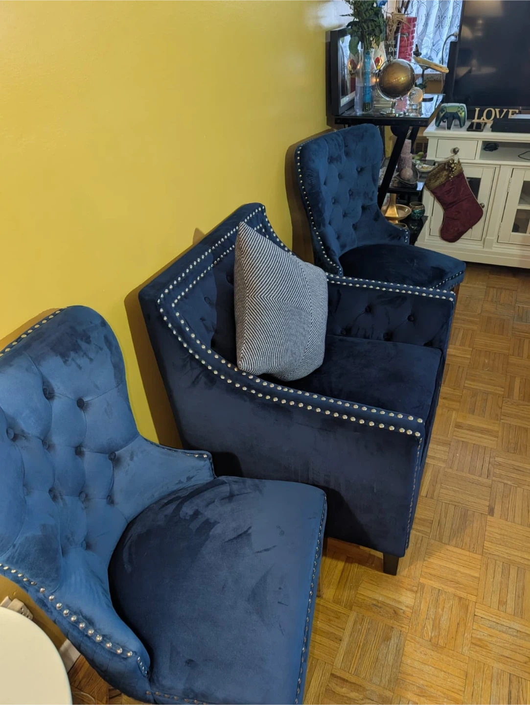 Selling a set of three beautiful navy blue accent chairs. They feature a tufted design and silver nailhead trim, adding a touch of elegance to any room. Perfect for a living room or dining area!