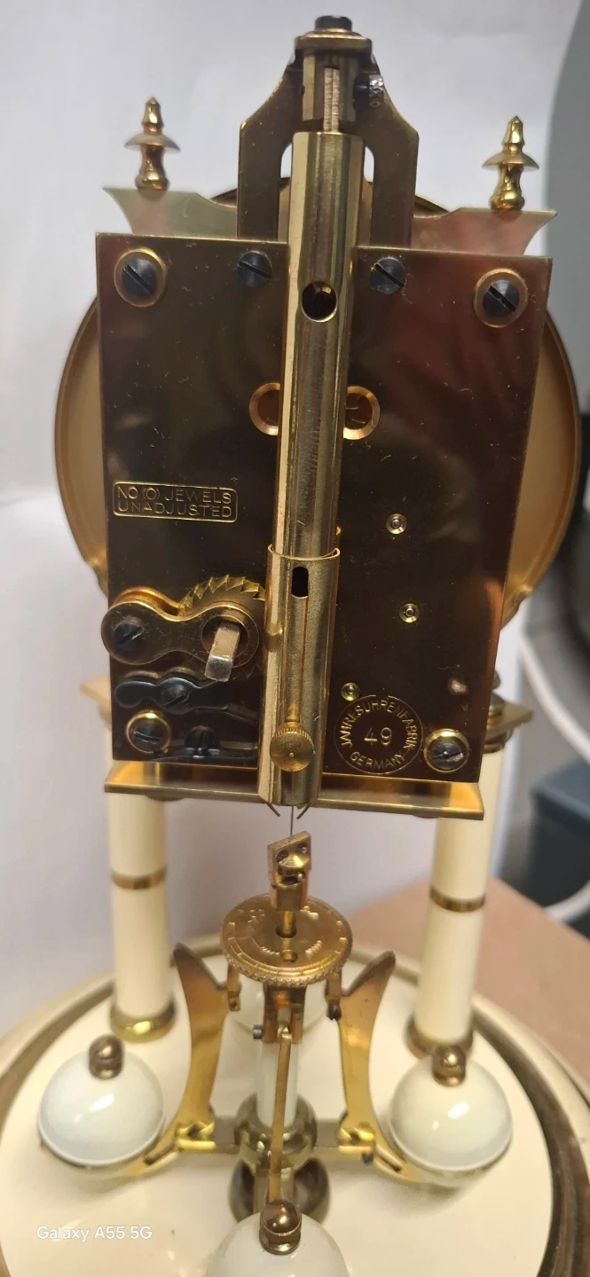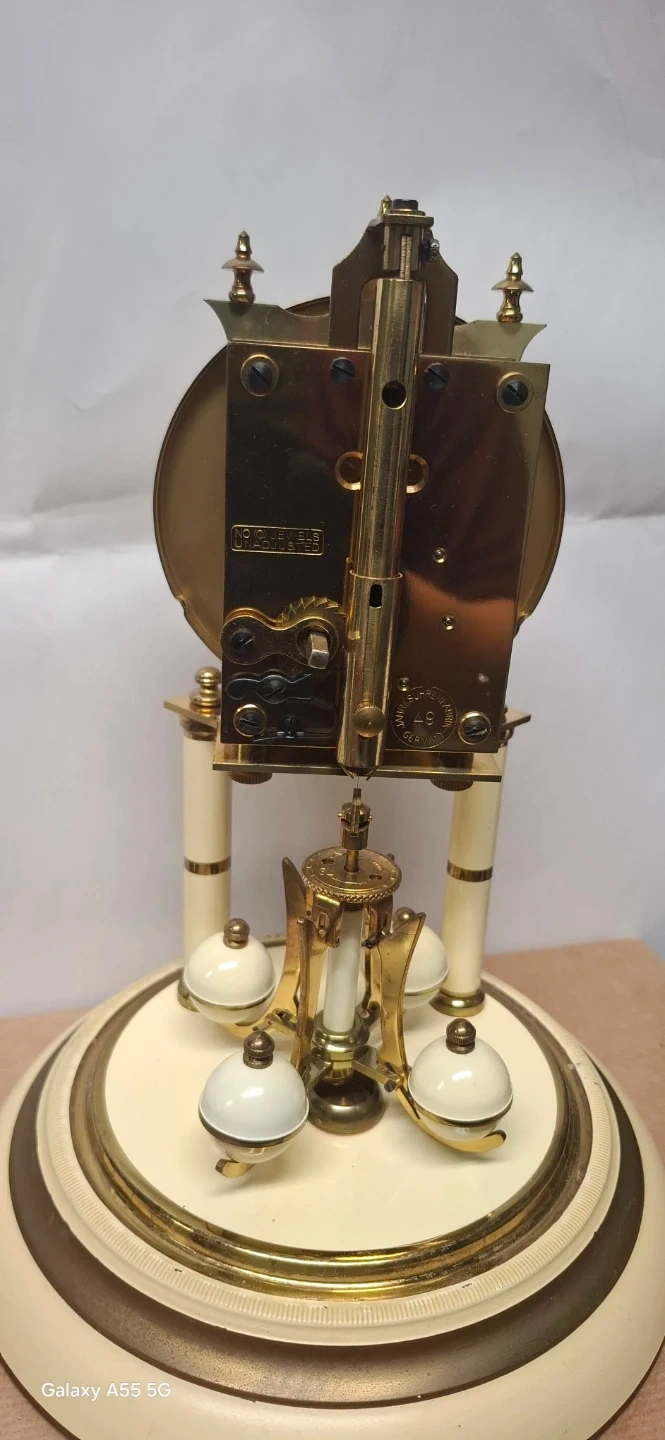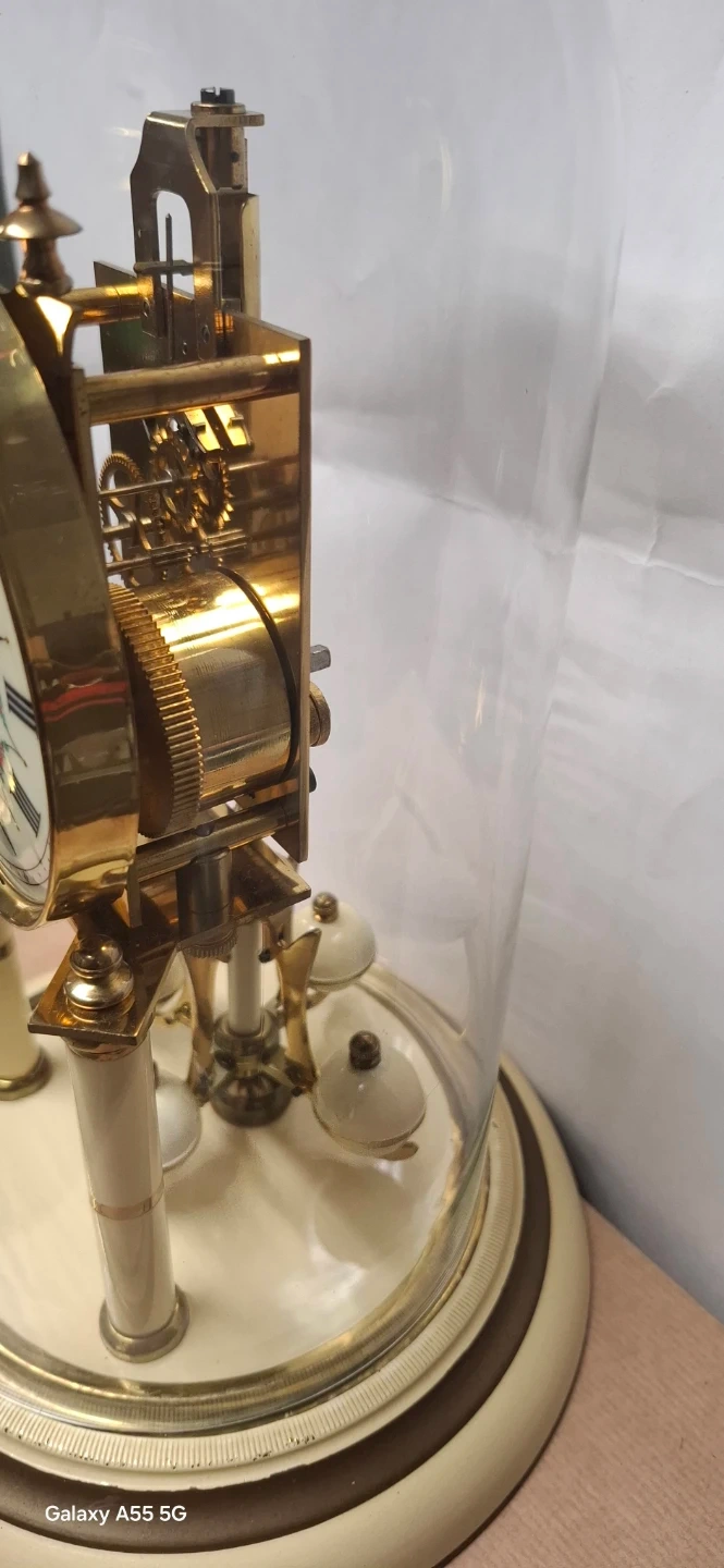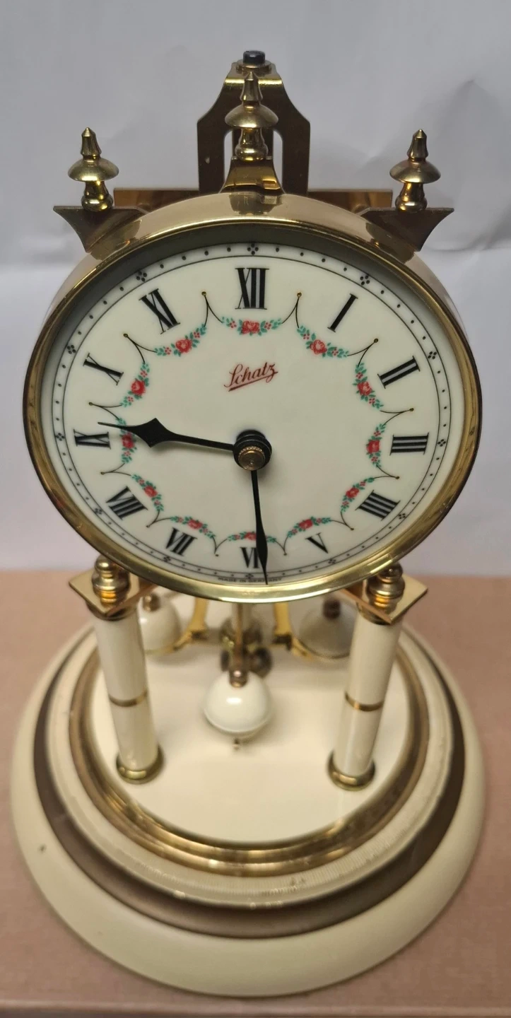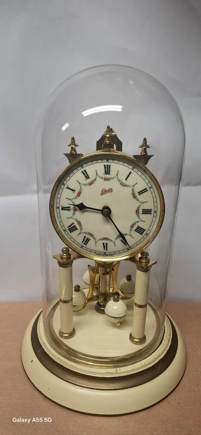 Selling a Schatz anniversary clock 1948. It has a glass dome and is made in Germany. The clock features a decorative face with Roman numerals and floral accents. The back showcases the clock's inner workings and gears
