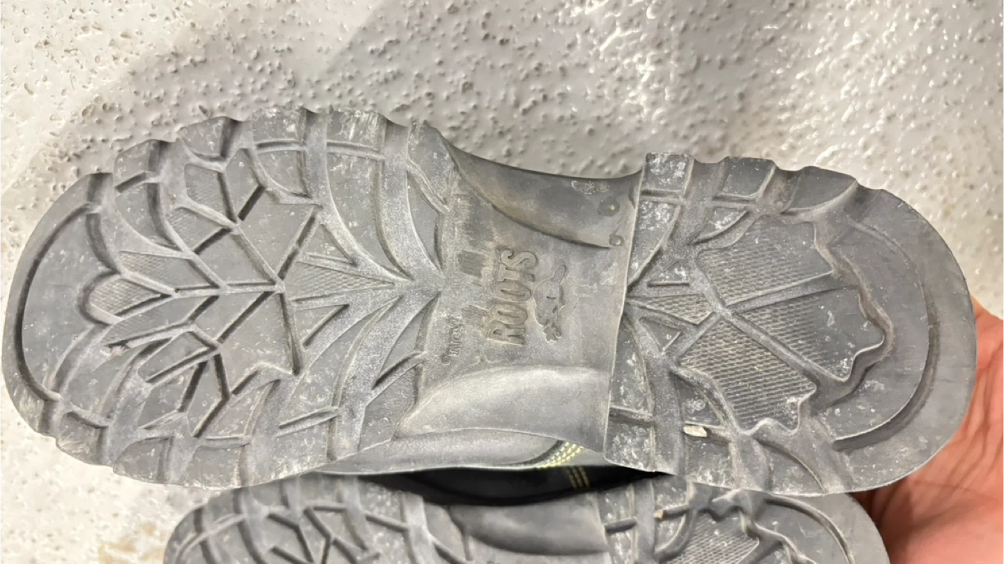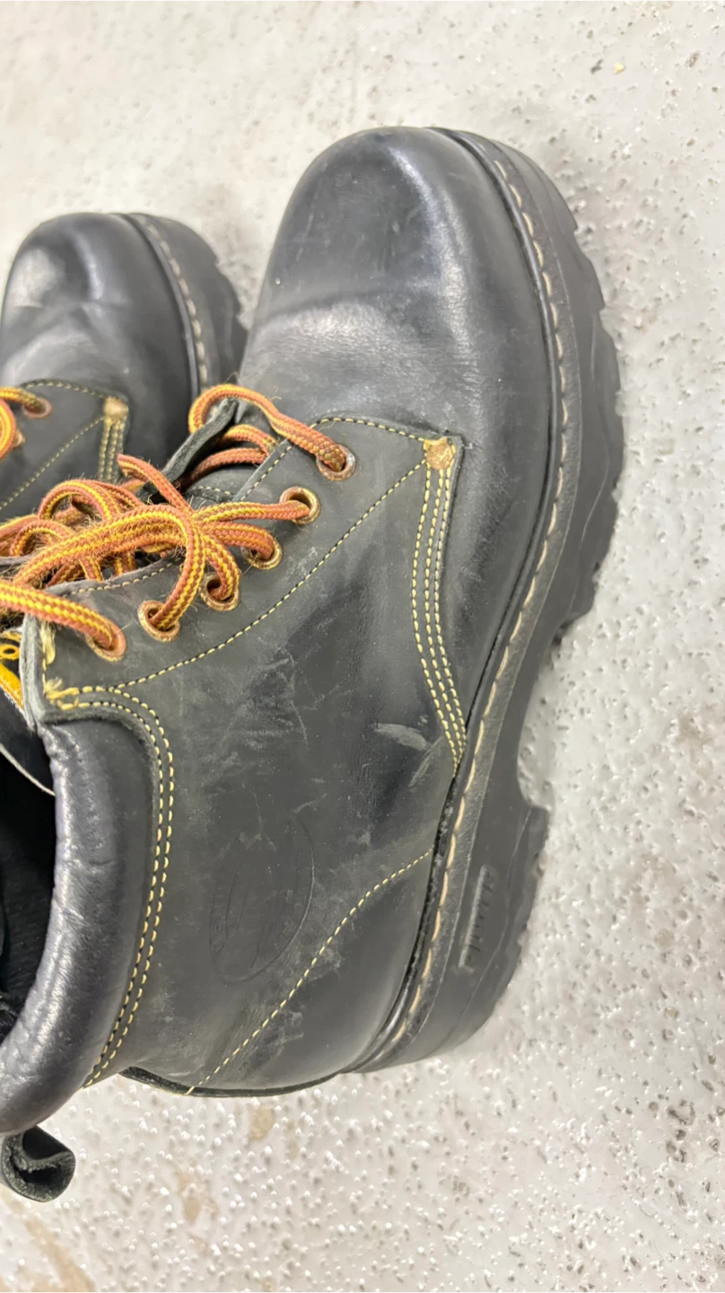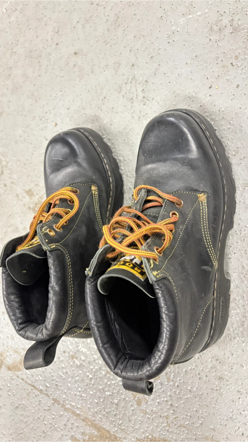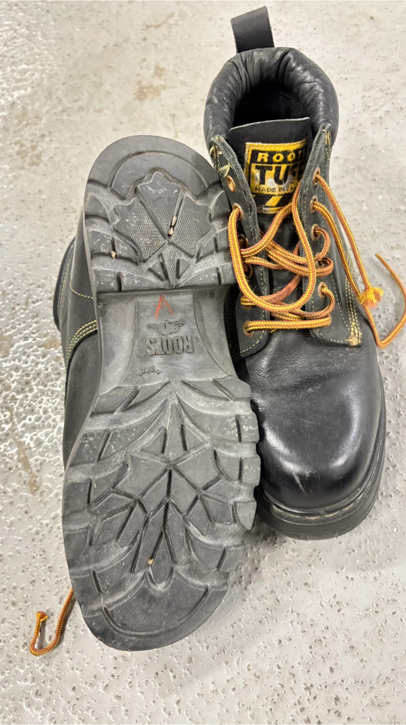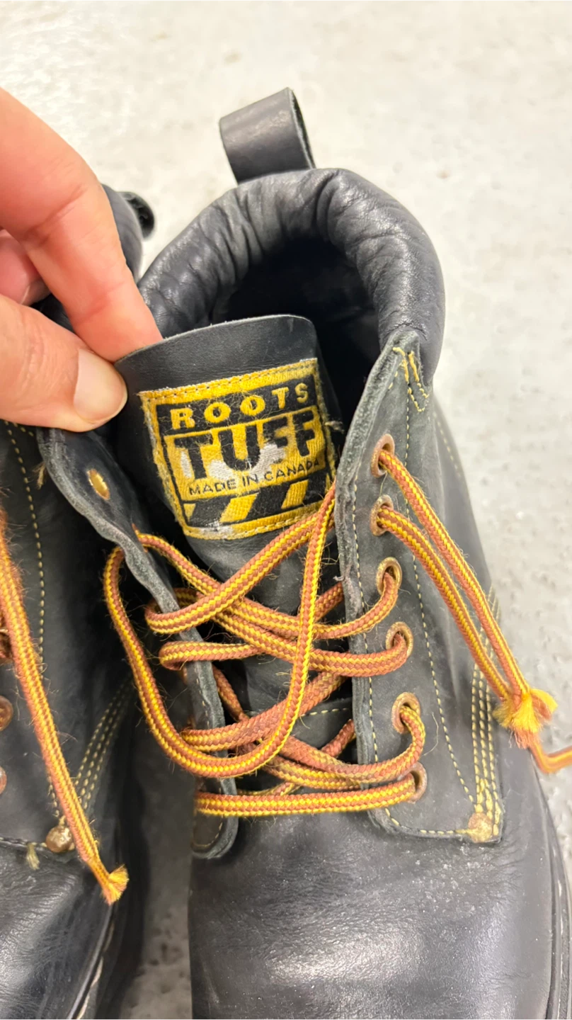 Selling a pair of Roots Tuff work boots in black leather. They show some signs of wear, but are still sturdy and ready for the job site! The boots feature a durable construction and are made in Canada.