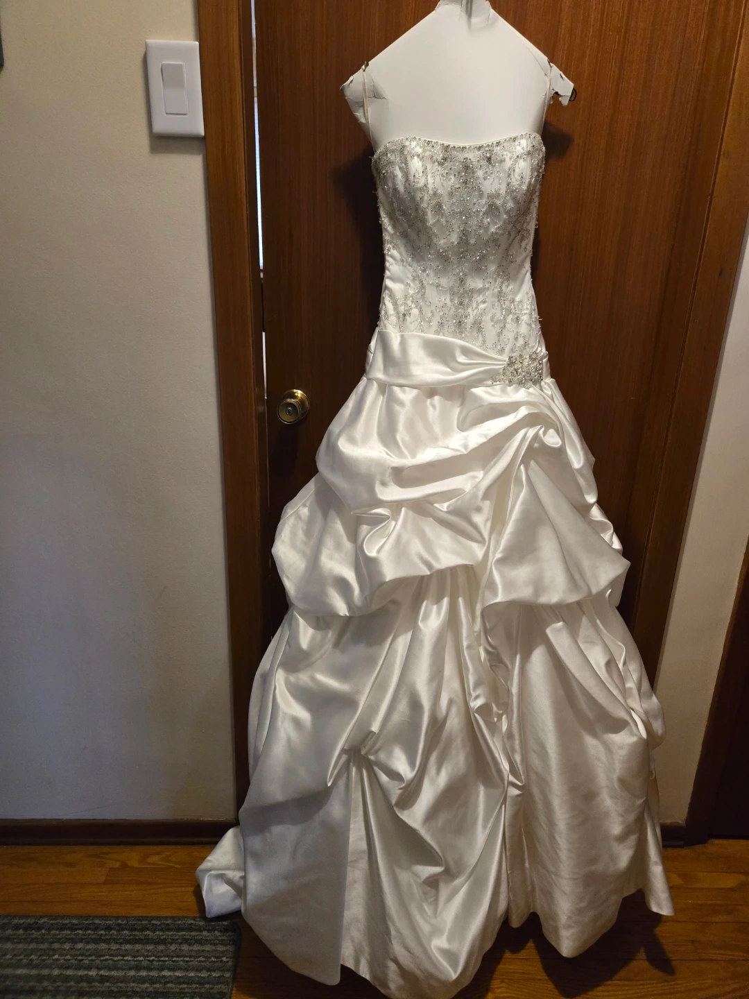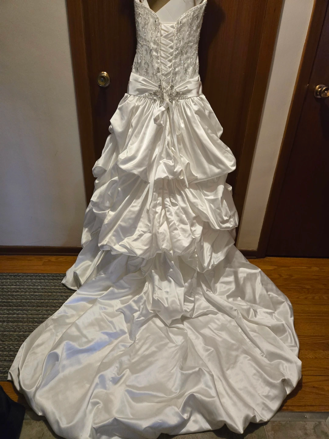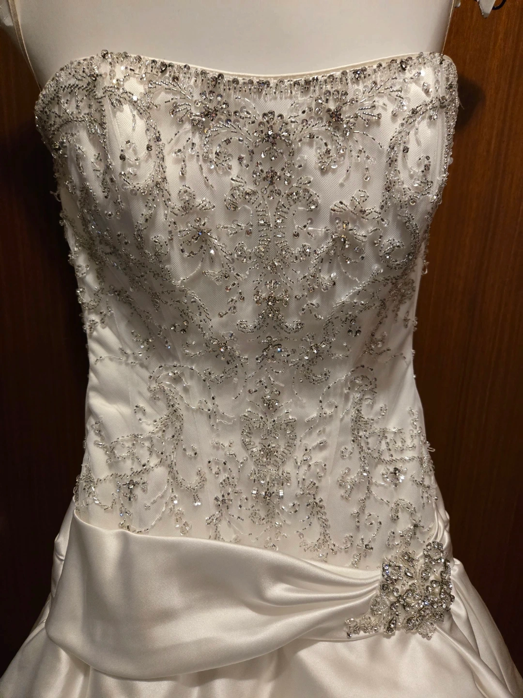 Selling a beautiful white wedding dress. It features intricate beading on the bodice and a layered skirt. Corset back.