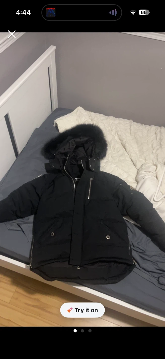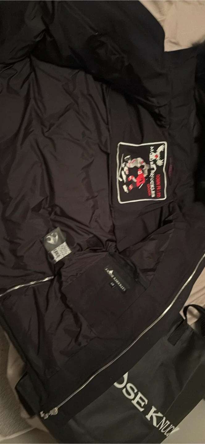 Here's a Moose Knuckles black down parka. It has a fur-trimmed hood and the brand's iconic metal logo on the sleeve. It's in great condition and ready for the cold weather!