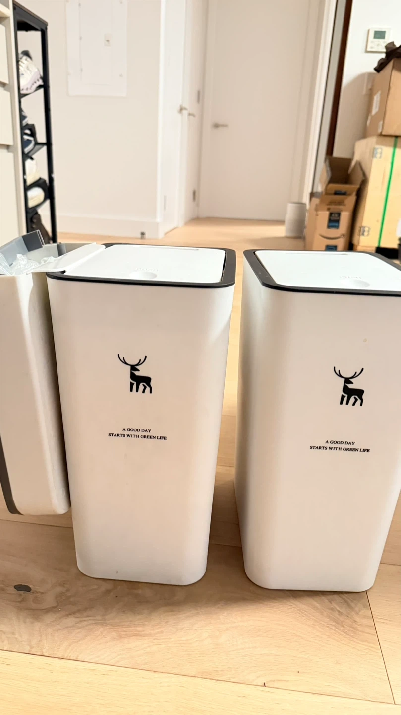 Selling a pair of white trash can featuring a deer logo and the phrase 'A GOOD DAY STARTS WITH GREEN LIFE' on the front