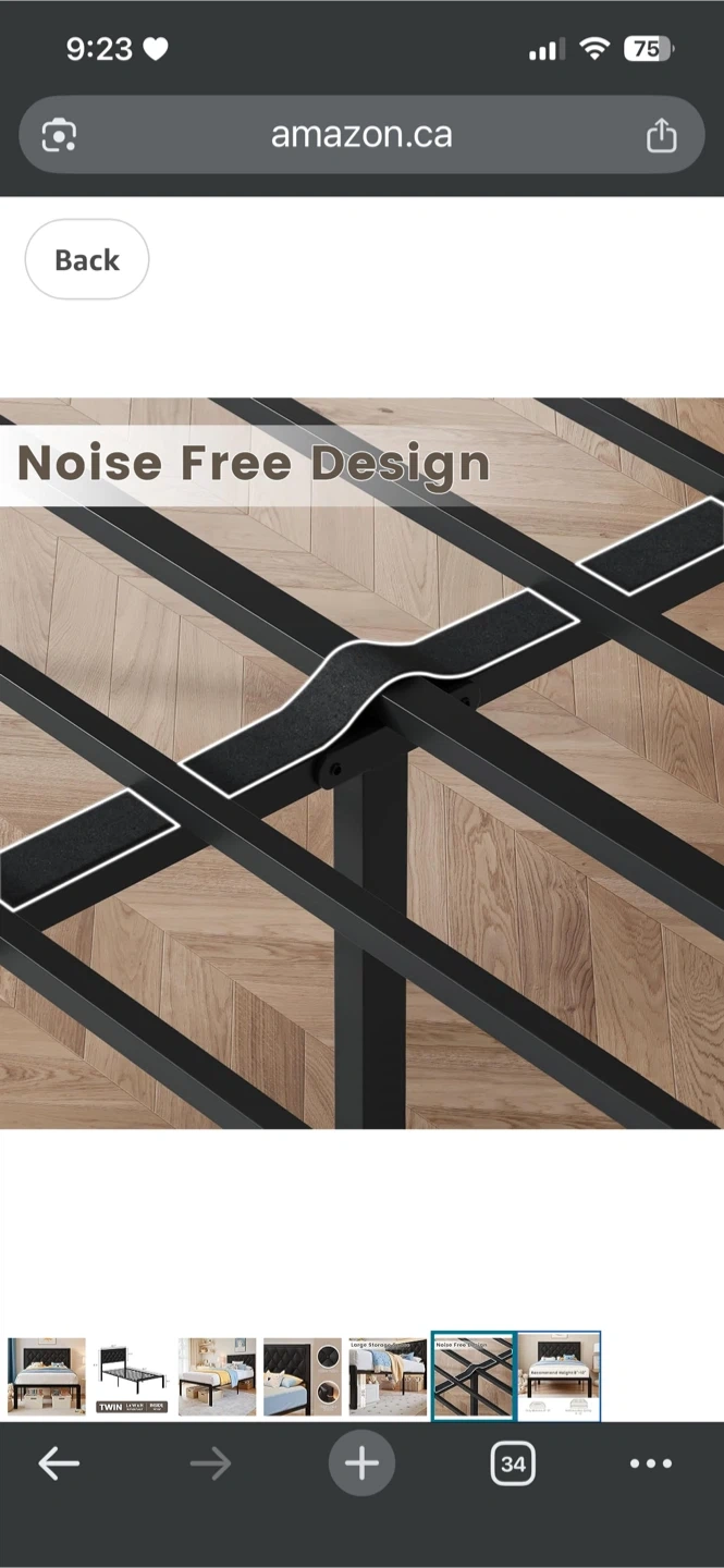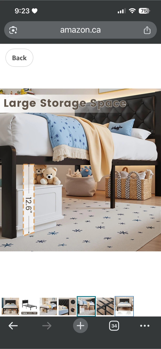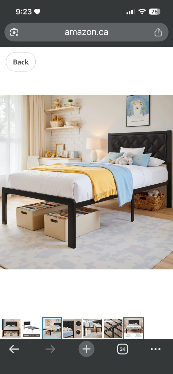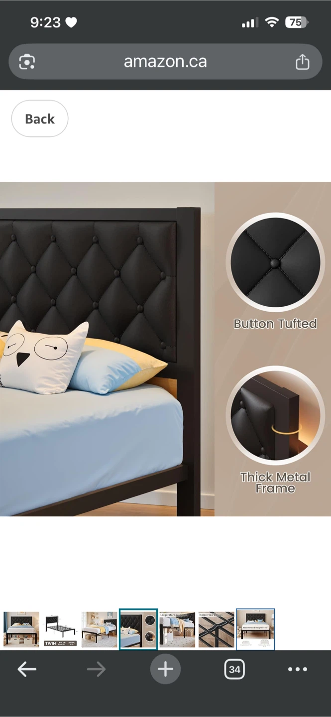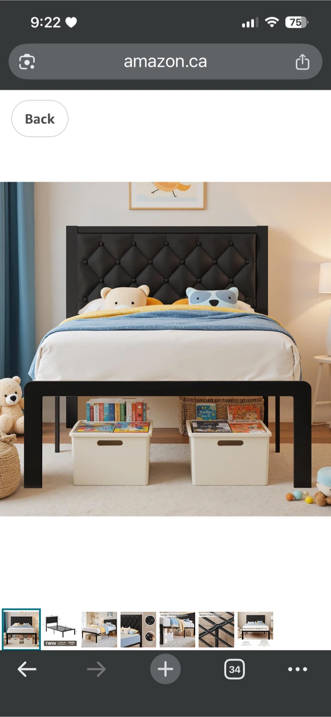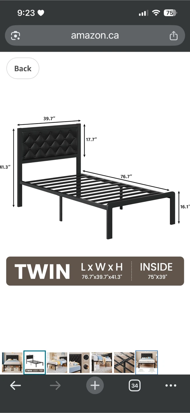 Selling a twin / single size bed frame! It's a black metal frame with a button tufted headboard. It’s unassembled in the box, too late for me to return after I bought the wrong one