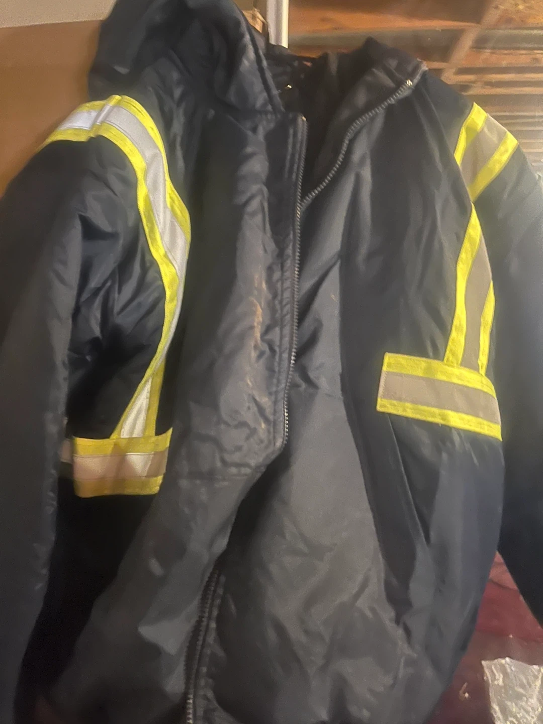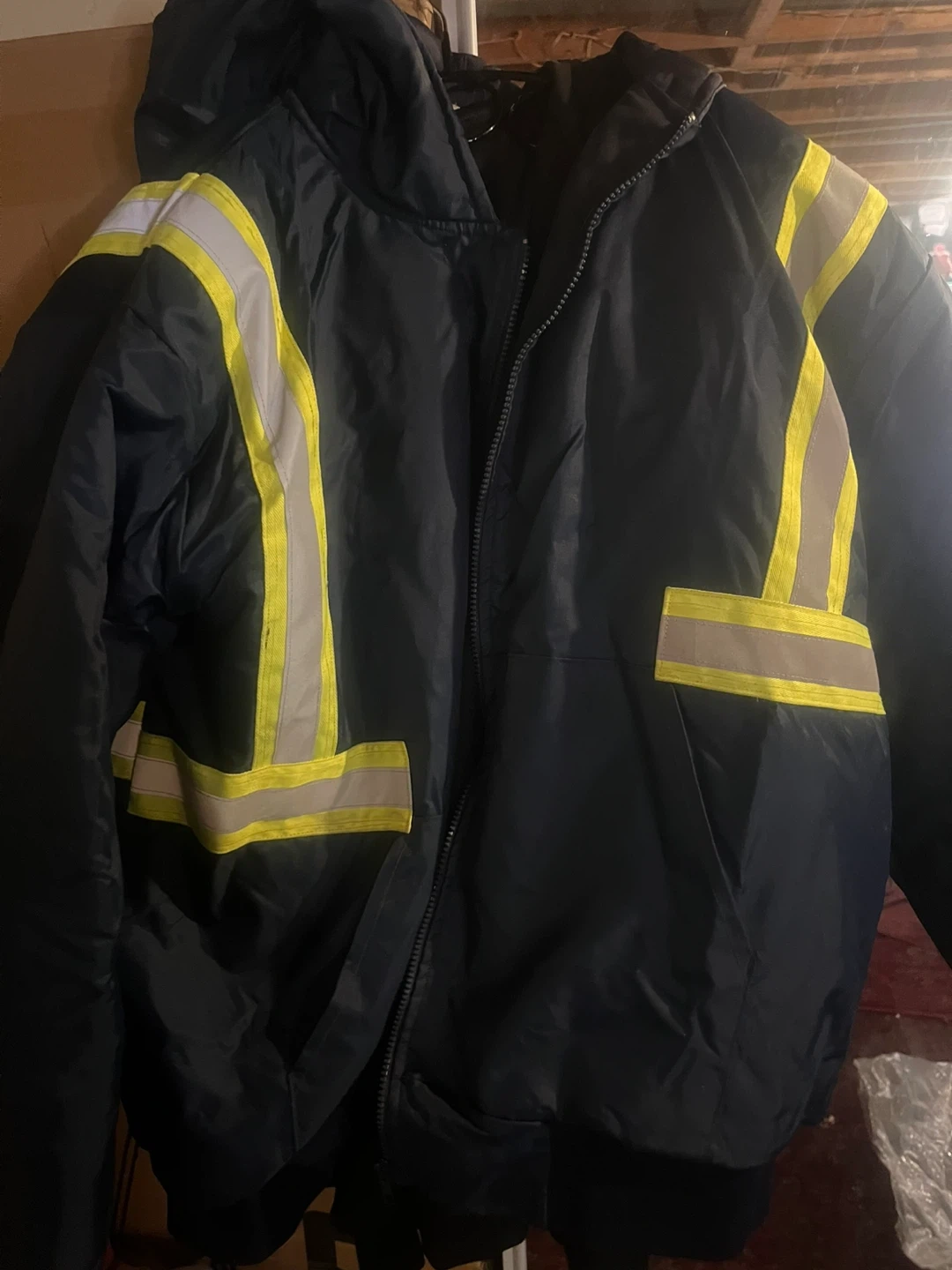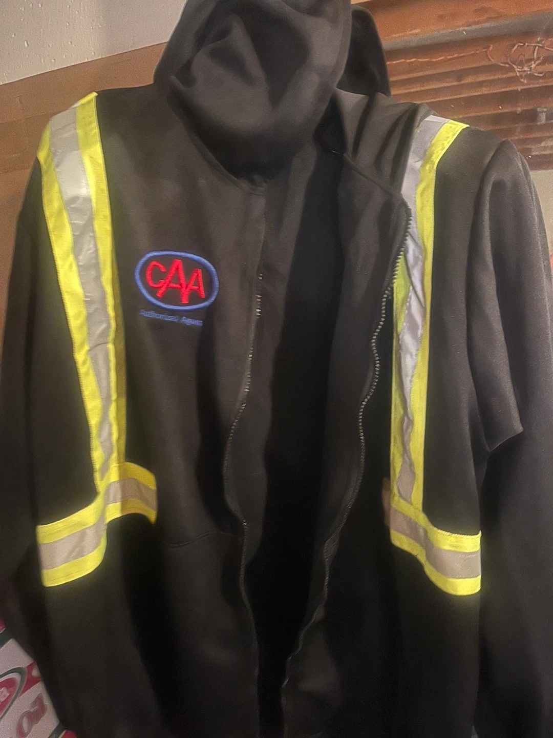 Selling a CAA safety jacket in size XL/TG. The jacket is black with reflective yellow stripes. There are some signs of wear on the front, as shown in the photos.