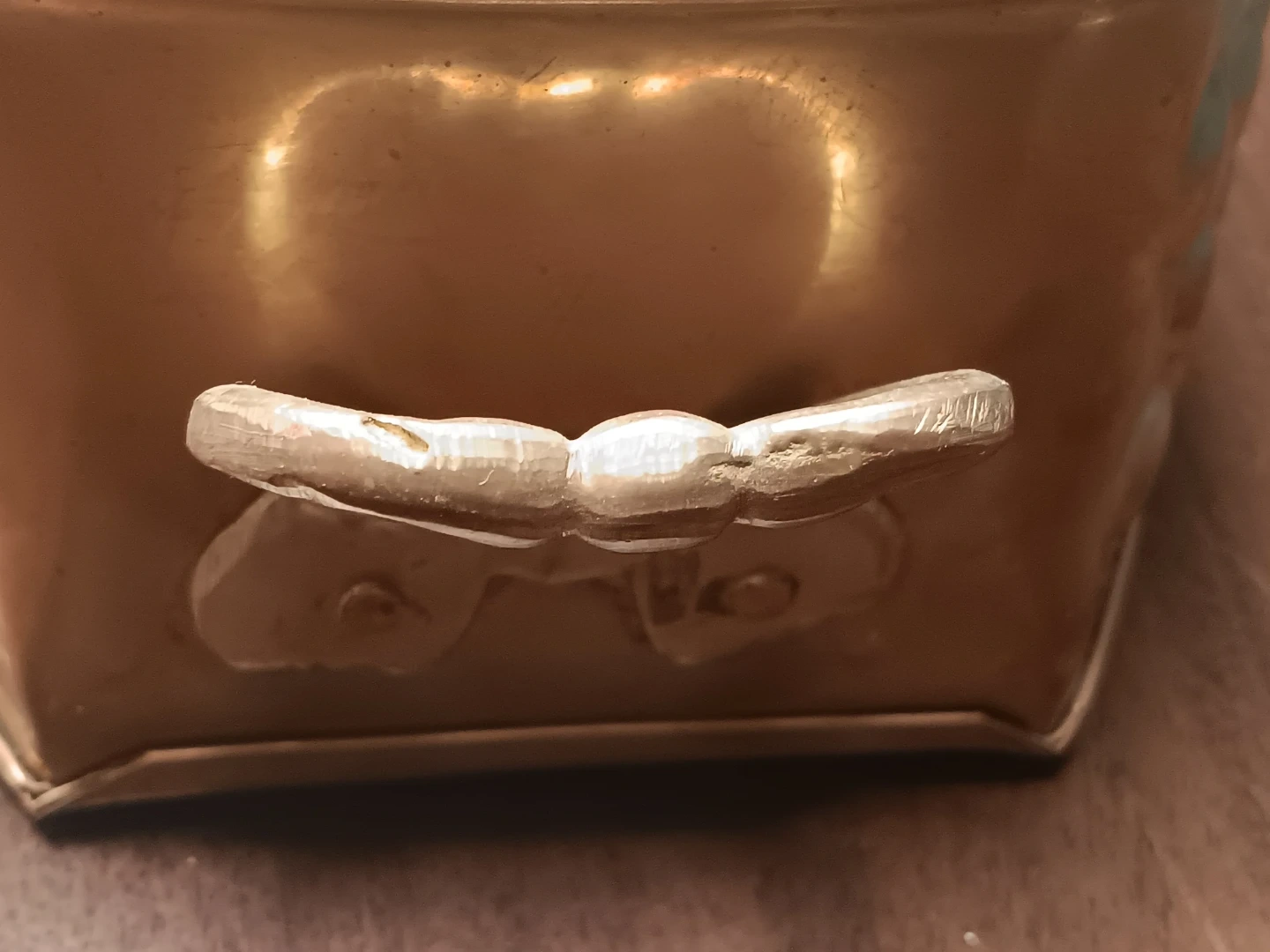 Selling a vintage decorative brass planter. It has a unique textured design on the sides. It's in good condition and would be a great addition to any home!