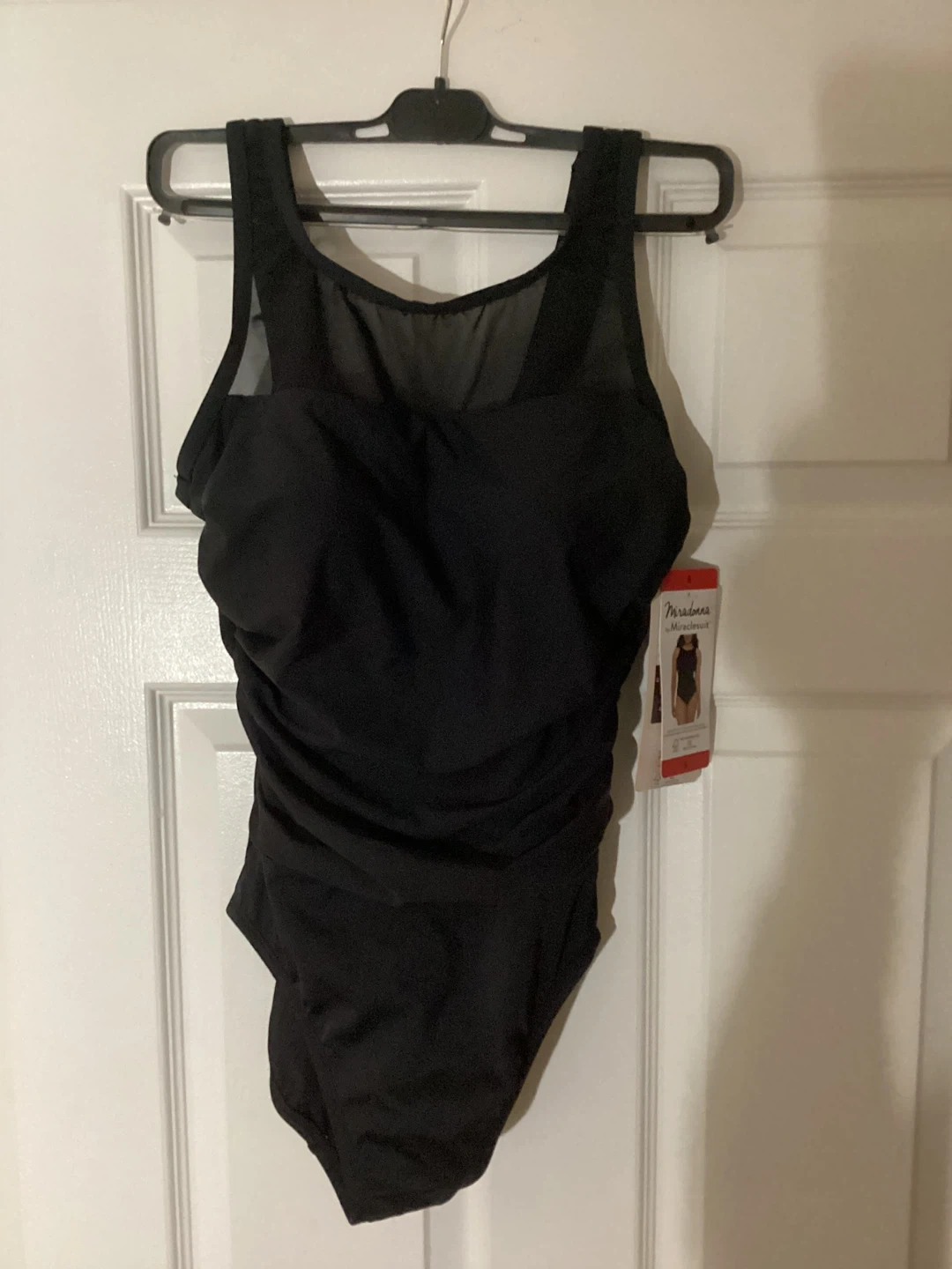 Selling a black sleek Miradonna by Miraclesuit swimsuit in black, size 8. It's a new classy suit with a mesh high neck ready for summer or spa! The tag is still attached.