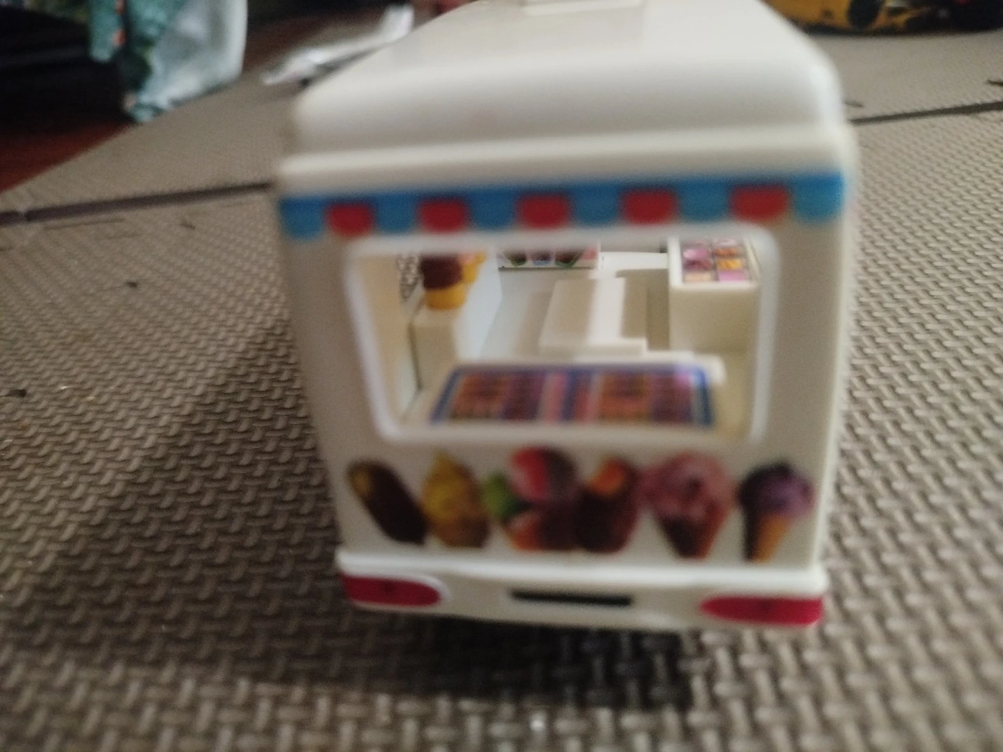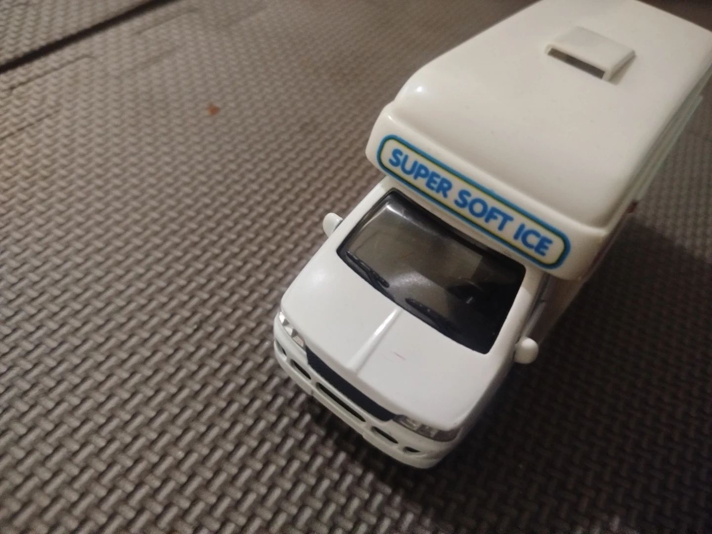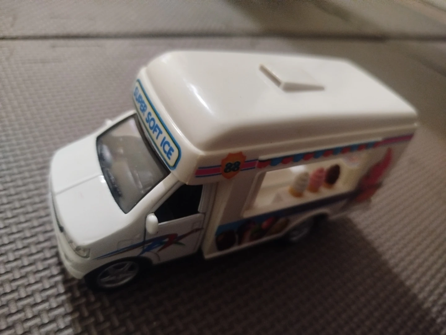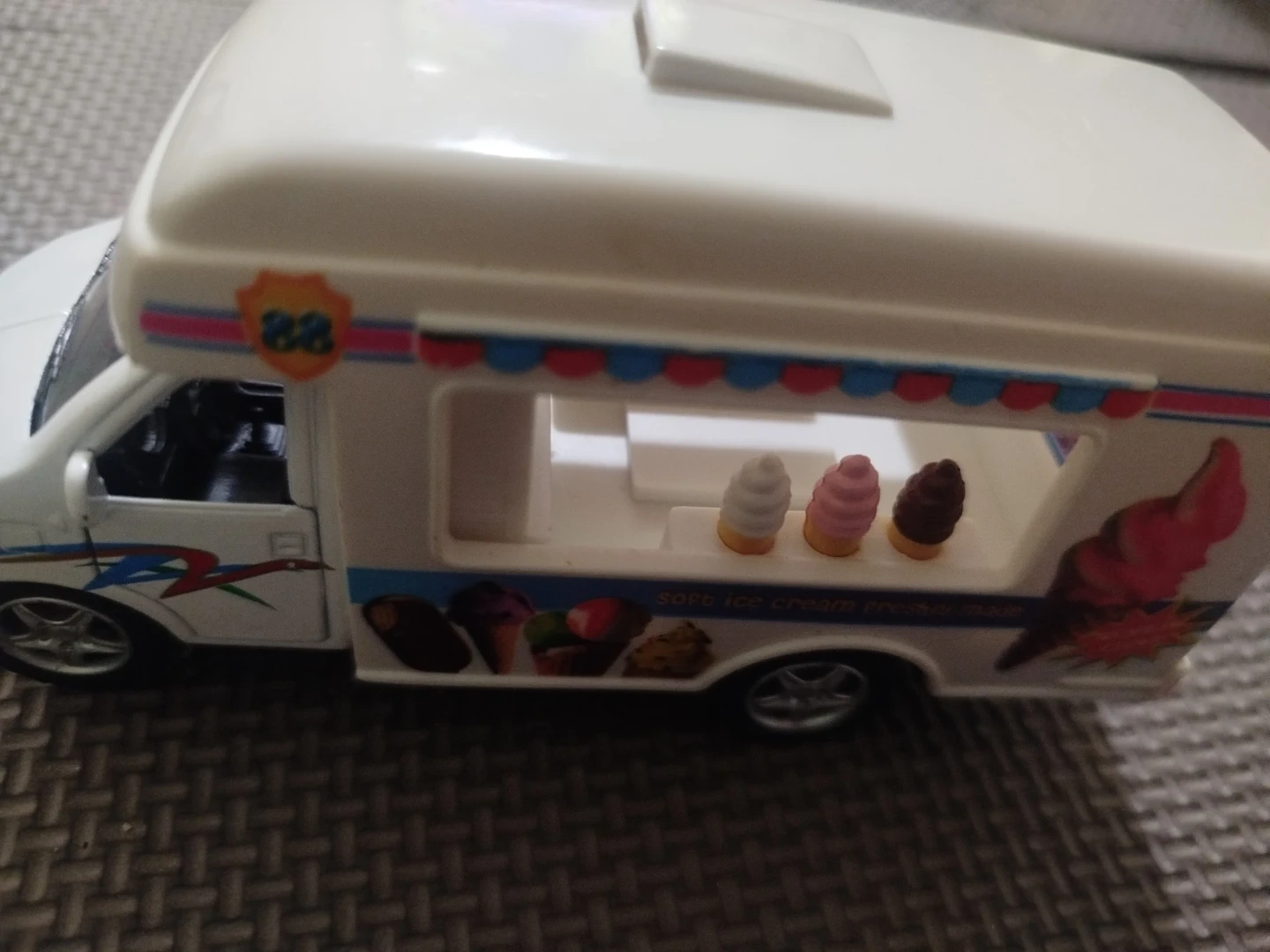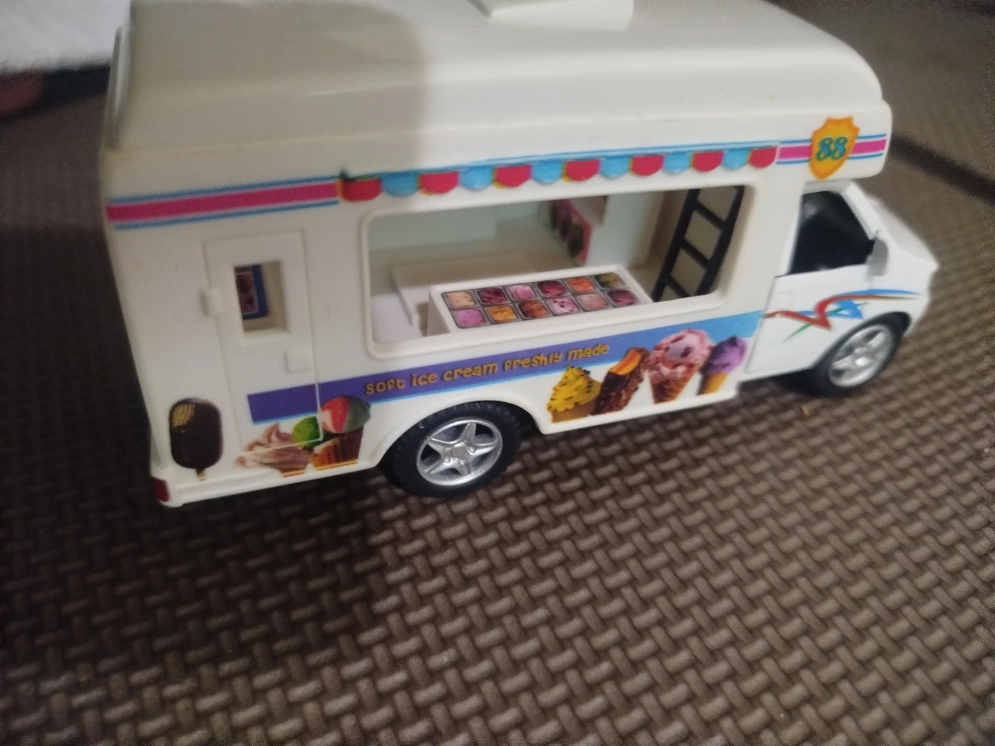 Selling a toy ice cream truck! It's white with colourful graphics of ice cream treats on the side. The top reads "SUPER SOFT ICE". It's in good condition, ready for a new home!