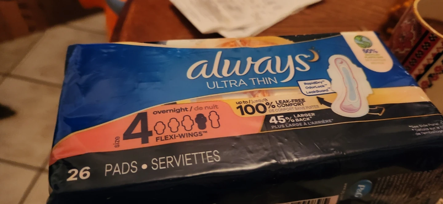 Selling a pack of Always Ultra Thin overnight pads. They are size 4 and come with Flexi-Wings for comfort. There are 26 pads in the pack, offering leak-free comfort and rapid dry technology.