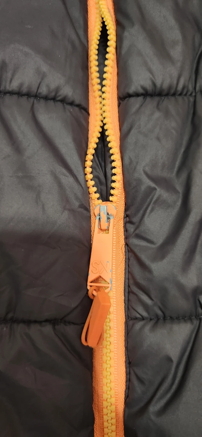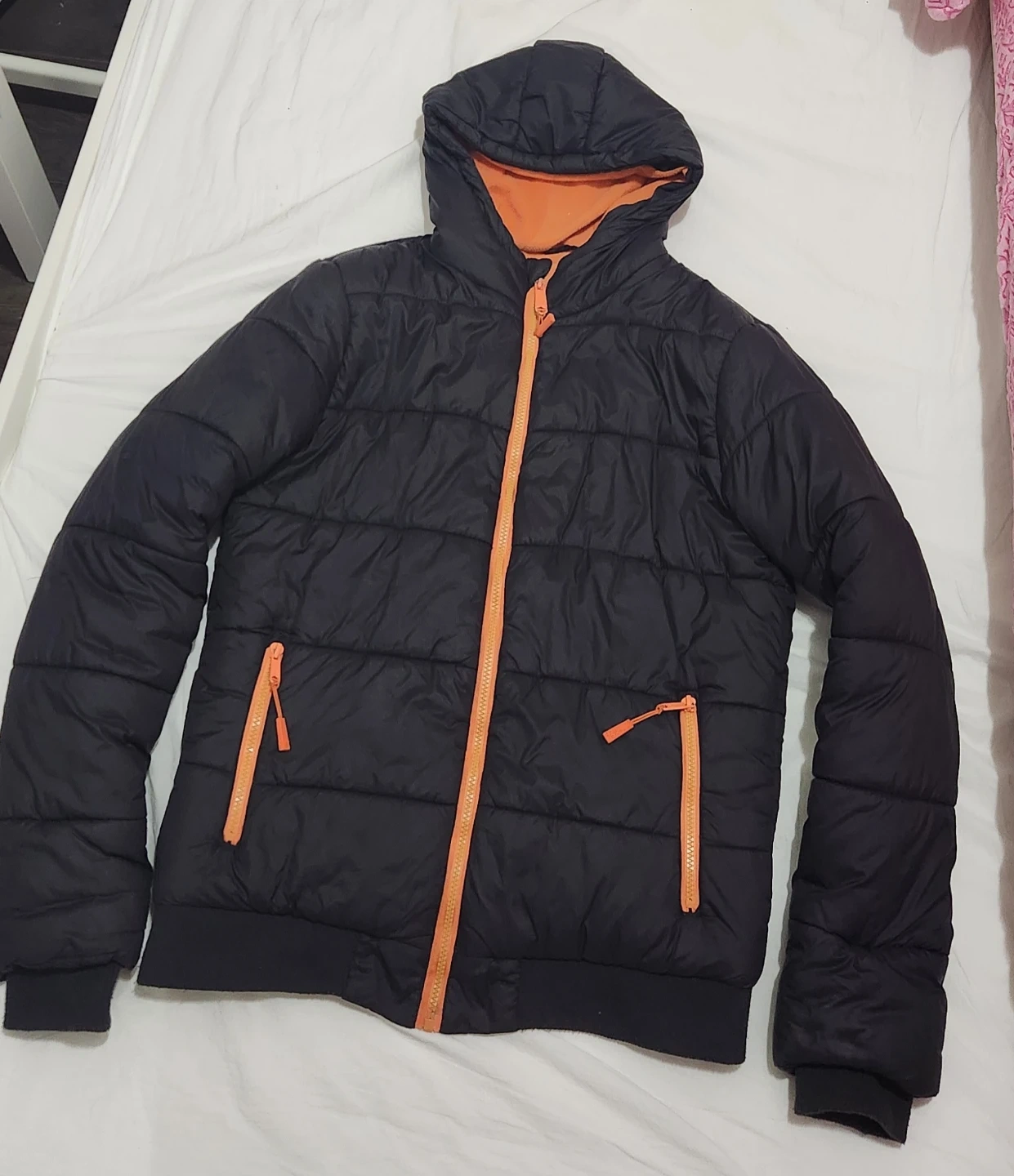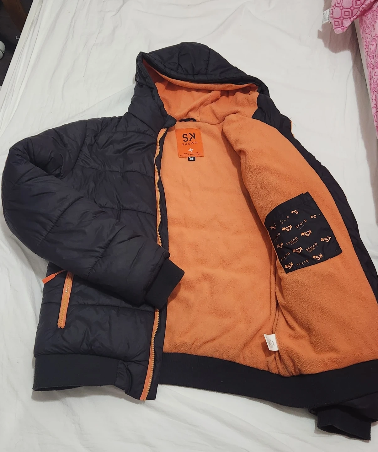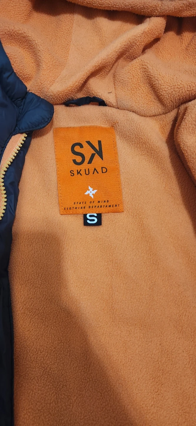 Cozy black puffer jacket from SK Sküad! It's a size small and features a hood and orange accents. Perfect for staying warm on those chilly days.