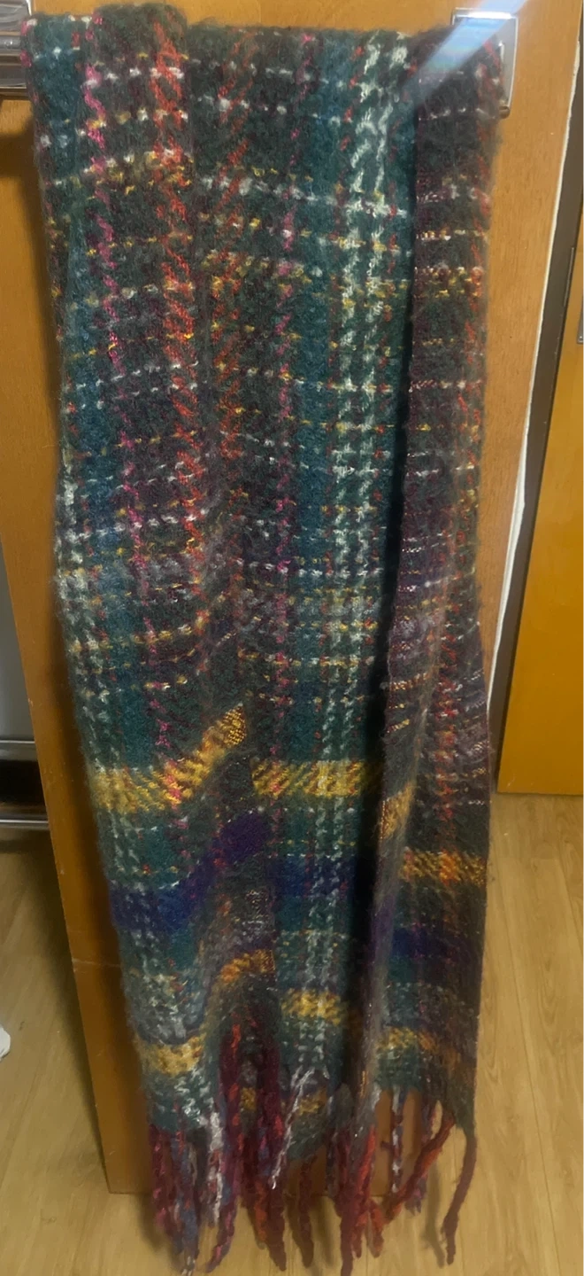 This is a cozy plaid oversized fuzzy scarf, perfect for chilly days! It features a mix of colours including green, blue, red, yellow, and purple in a textured plaid pattern. It has a fringed edge. It's in great condition (i’ve only worn it a few times) and ready to keep you warm this winter.