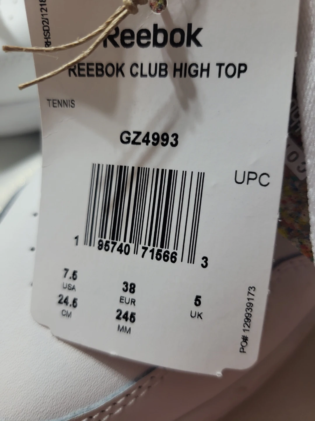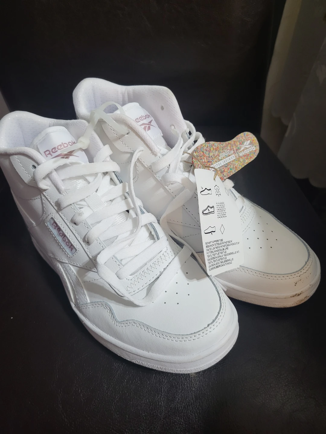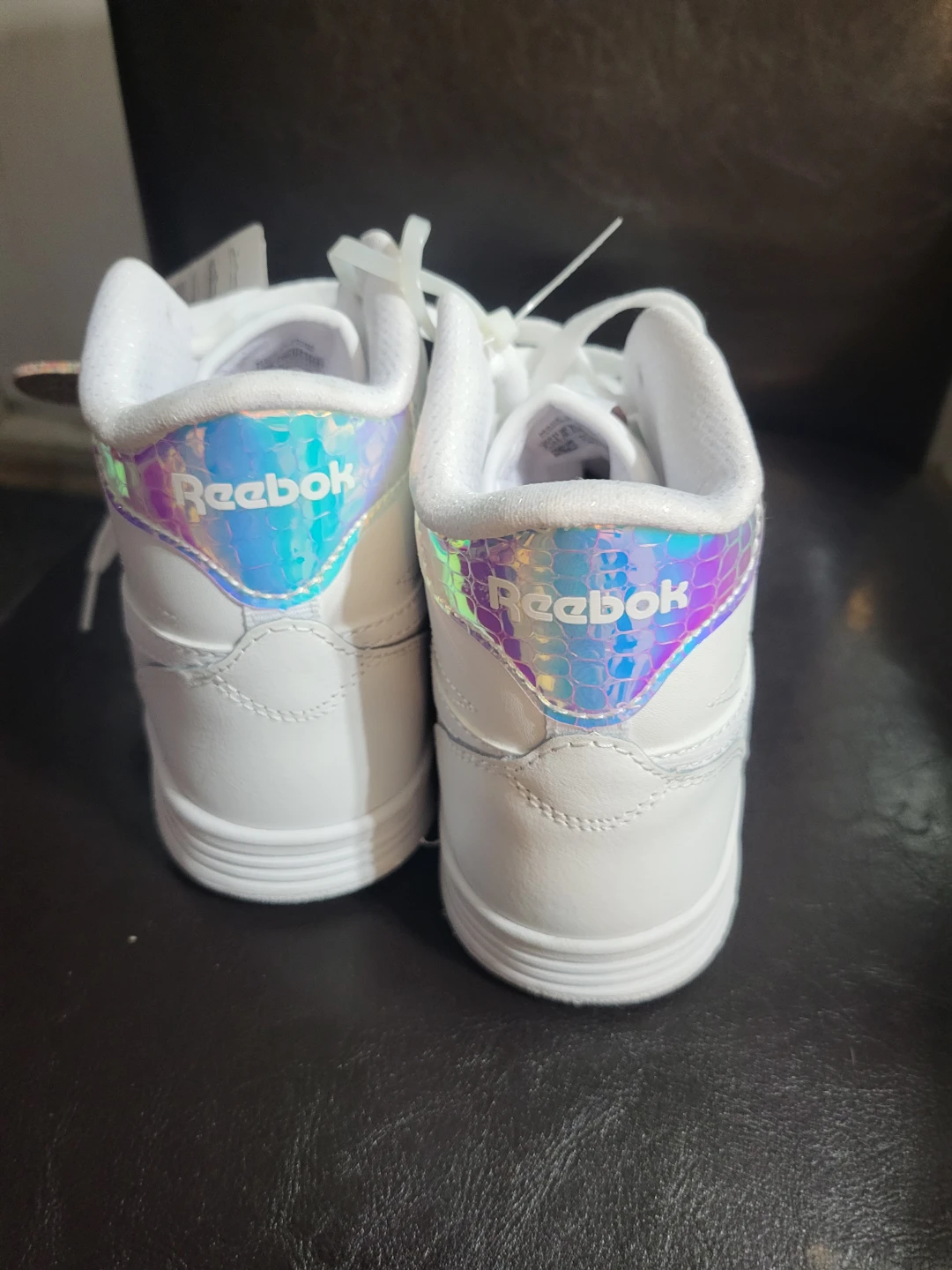 Selling a brand new pair of Reebok Club High Top sneakers in size 7.5. These white tennis shoes have a stylish, iridescent Reebok logo on the back. Never worn!