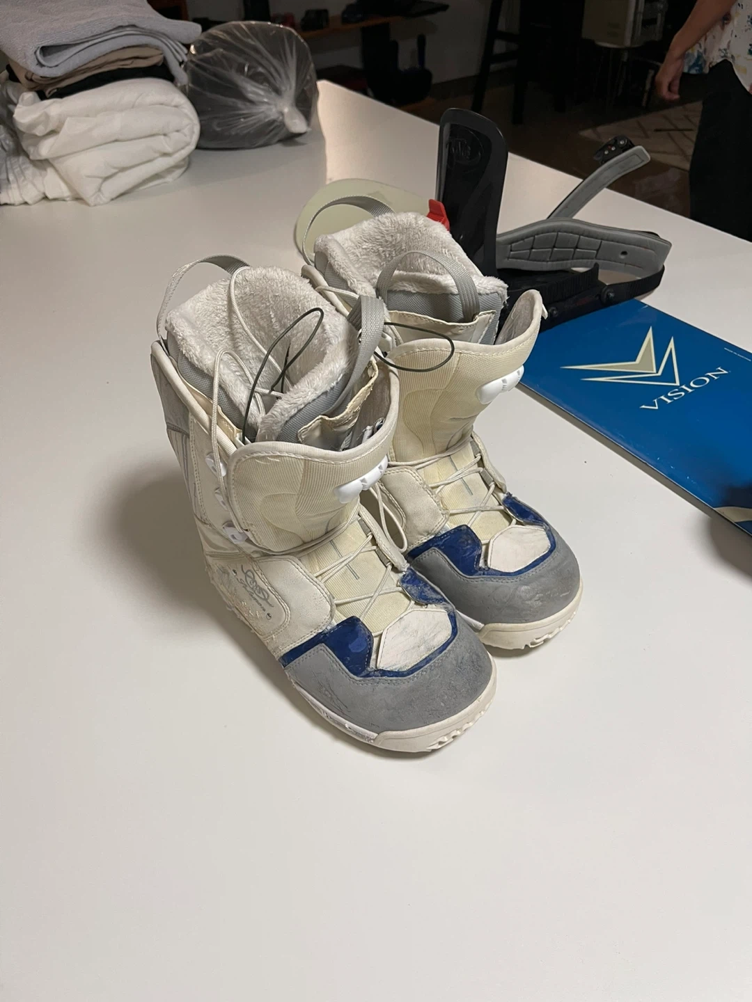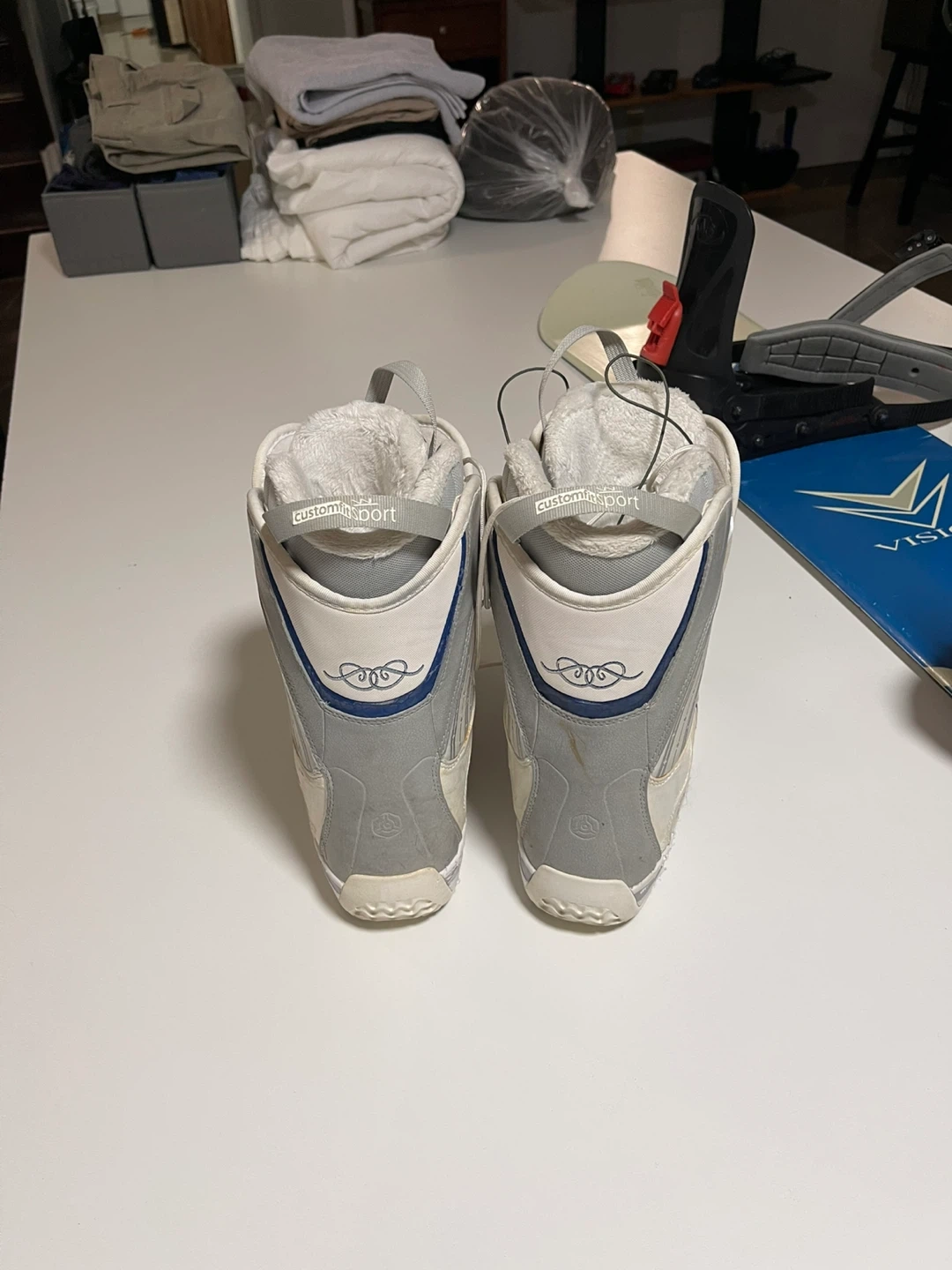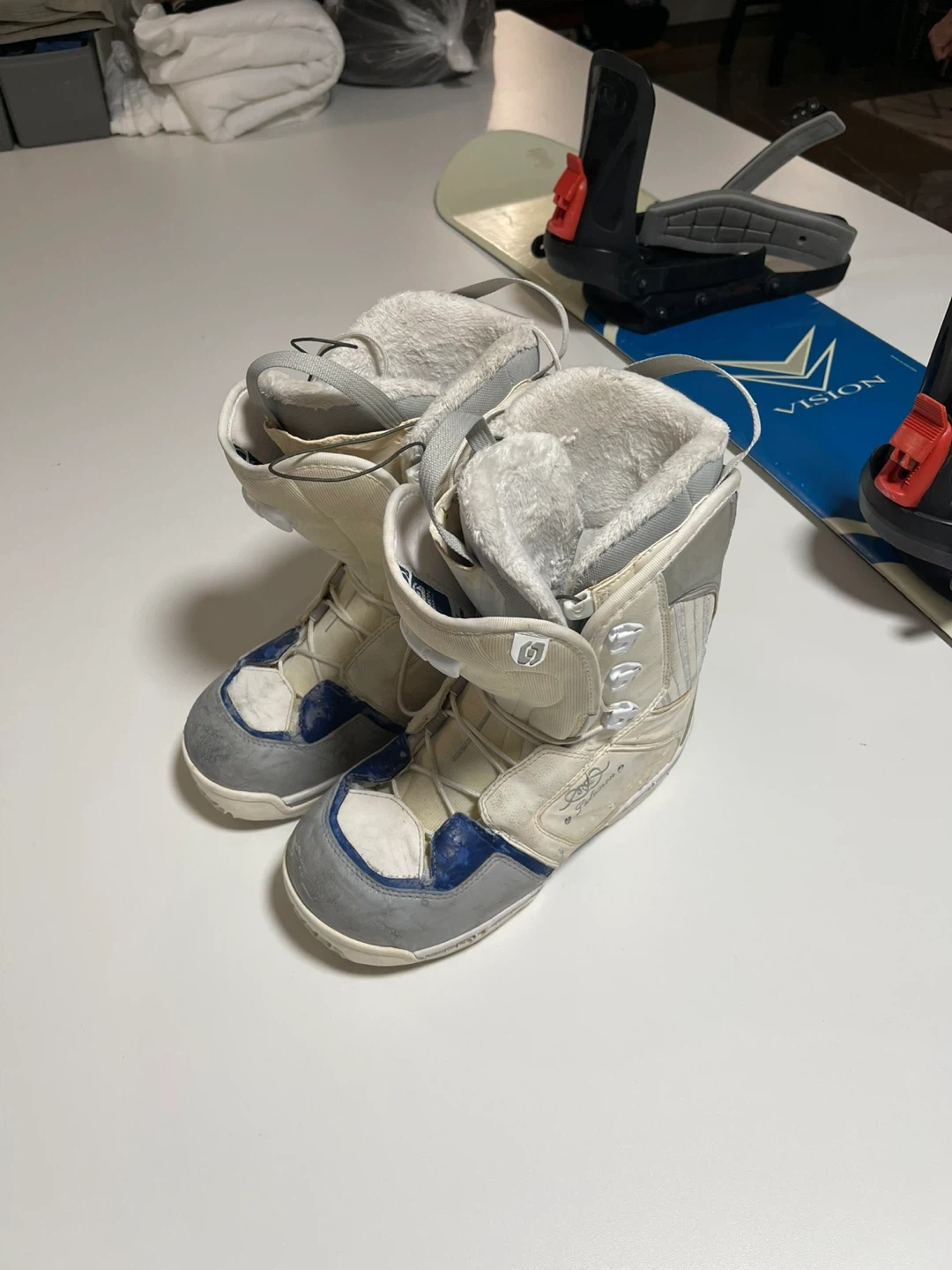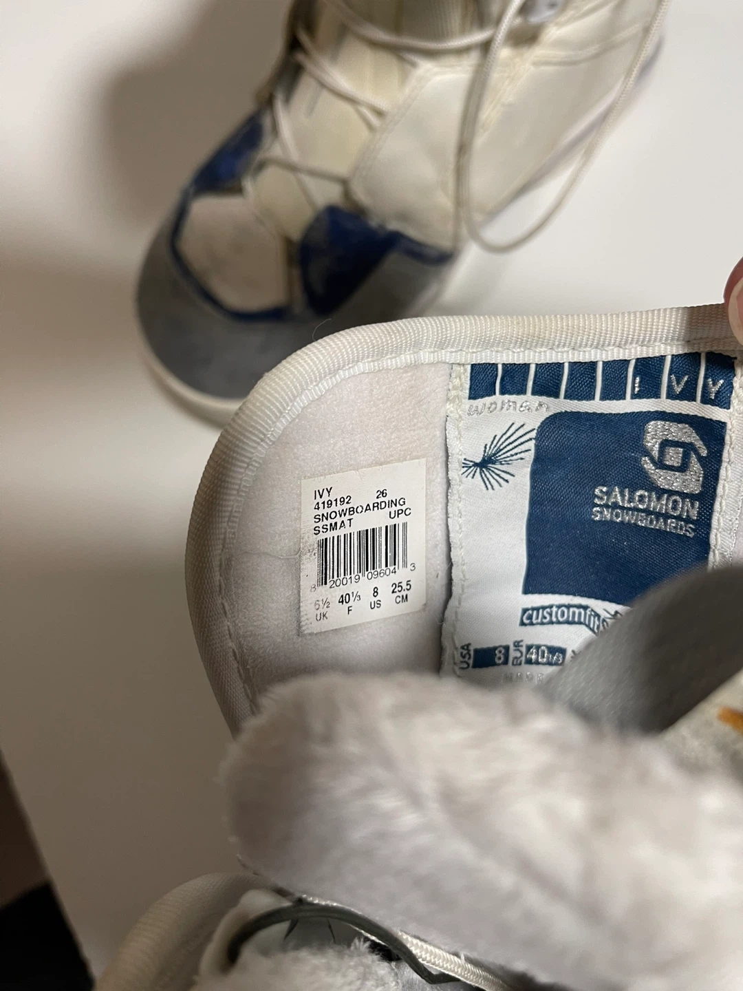 Selling a pair of Salomon Ivy snowboarding boots in size 8. They're in good condition and ready for the slopes! The boots are a stylish grey and white colour, perfect for any snowboarder looking for comfortable riding.
