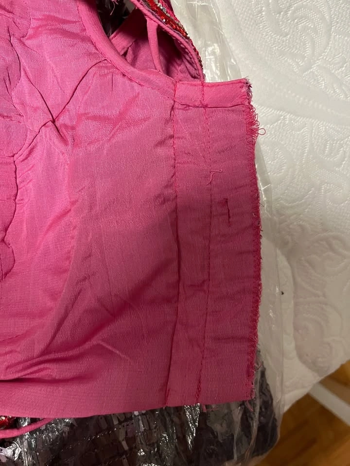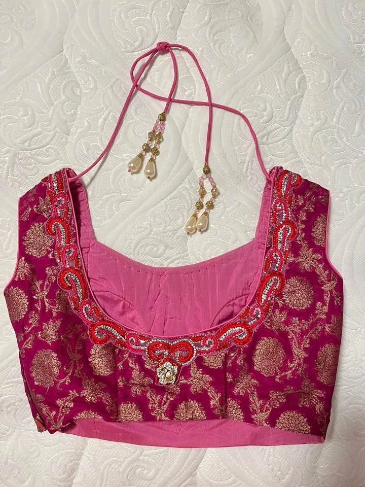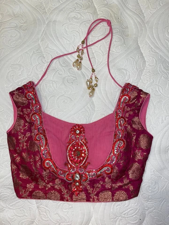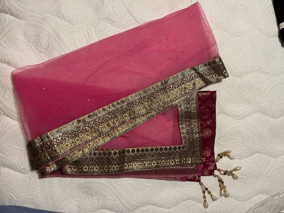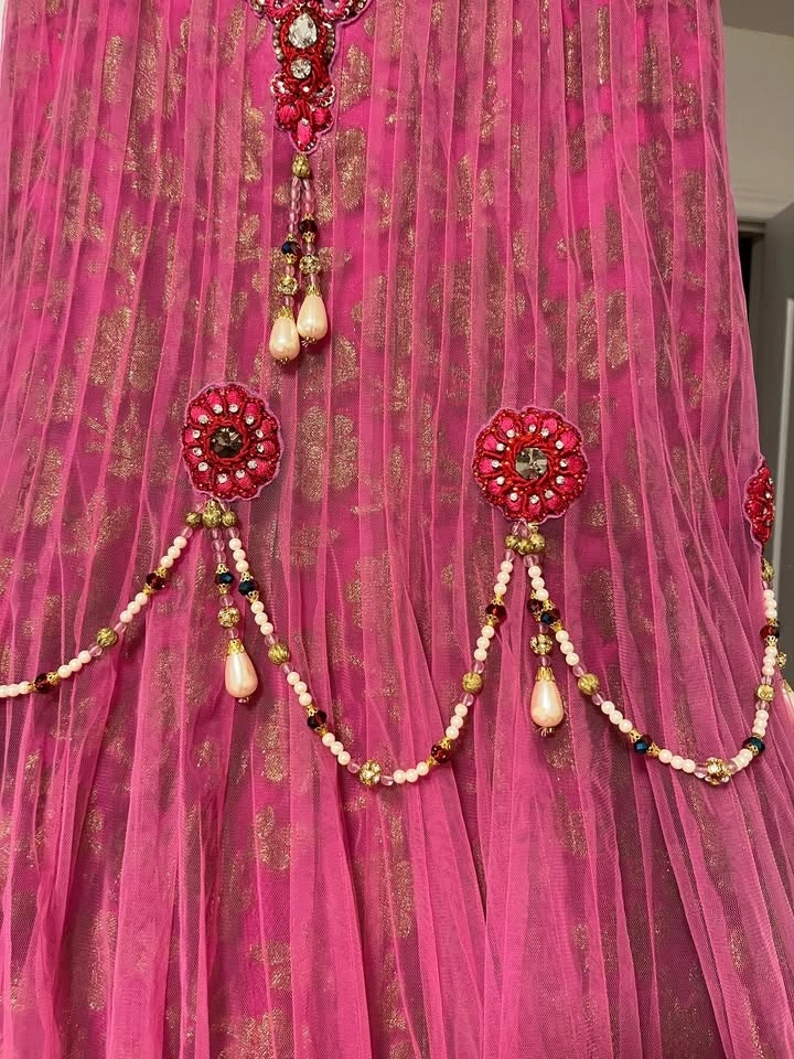 Beautiful hot pink lehenga with red and pearl accents worn only once at a wedding.