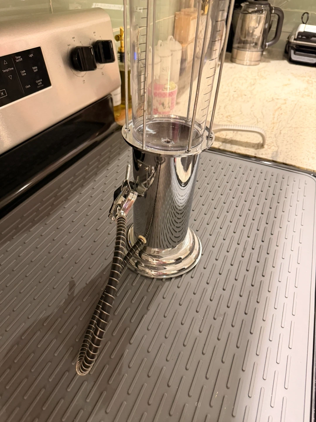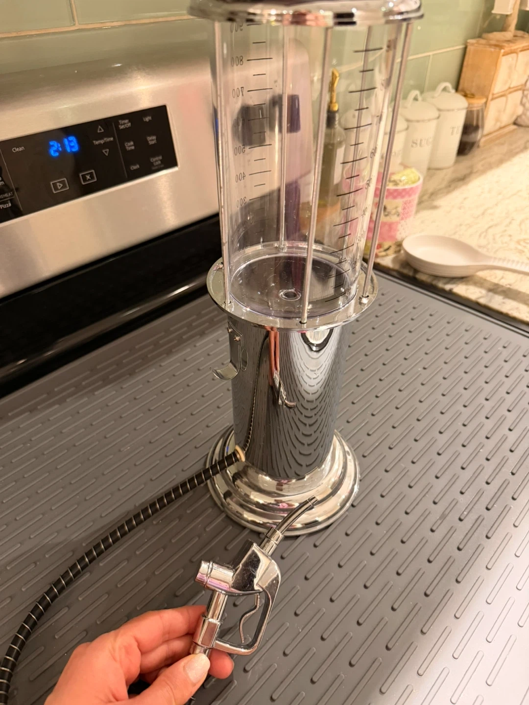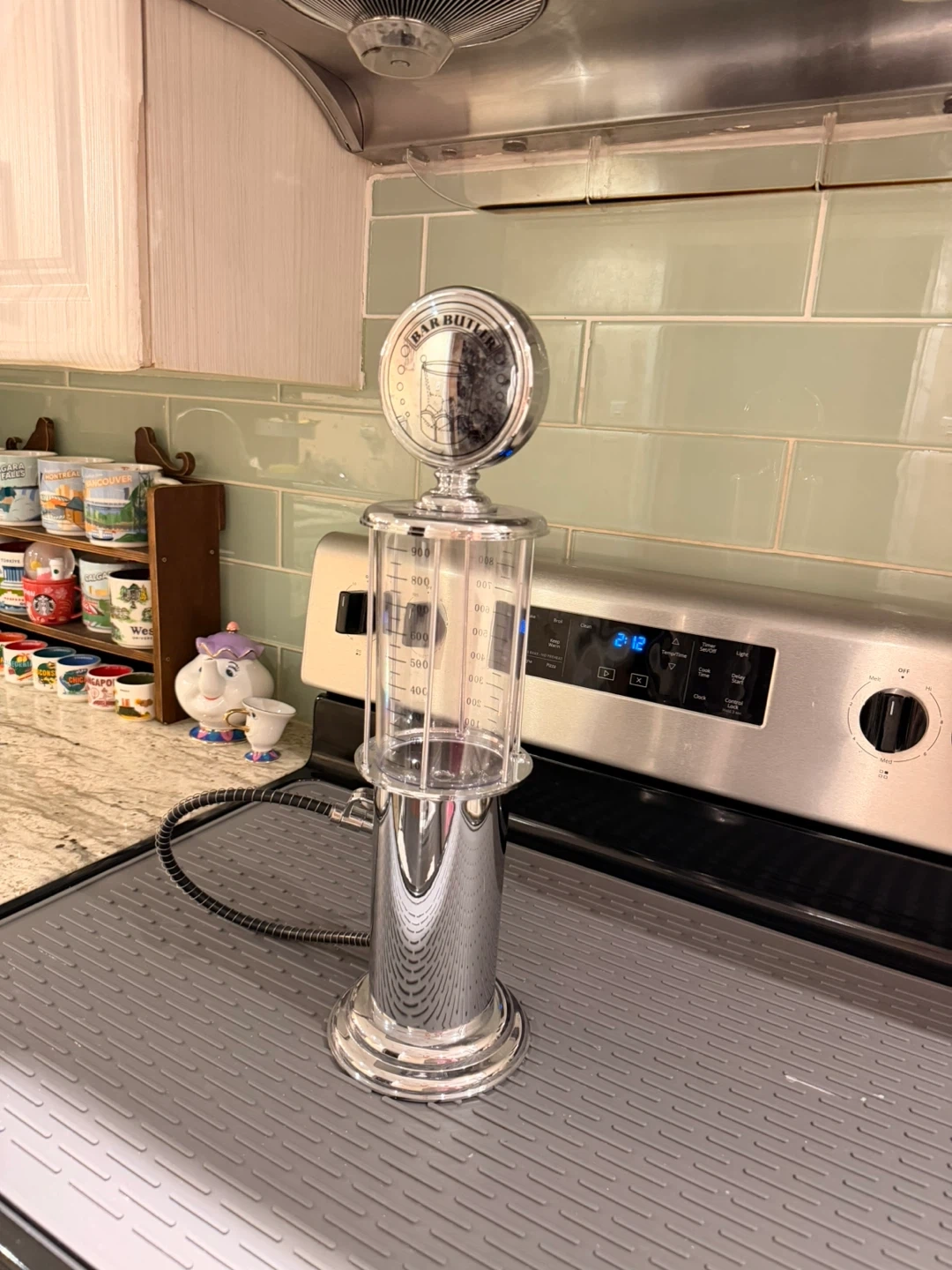 This Bar Butler liquor dispenser is a fun and unique addition to any home bar! It's designed to look like a vintage gas pump, adding a touch of retro charm to your drinks service. The dispenser is in great condition and ready to use for your next party or gathering
