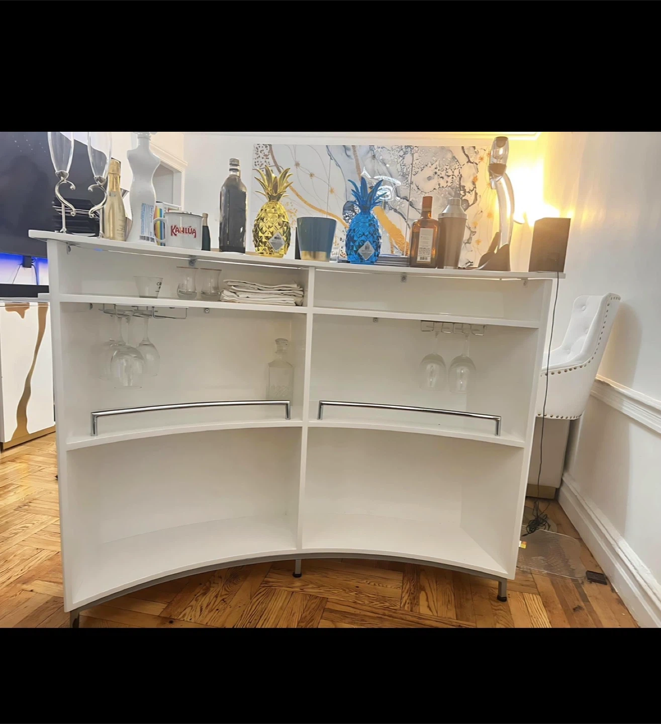 Selling a stylish white bar, perfect for entertaining! It features a sleek, modern design with ample storage space for bottles, glasses, and bar accessories. This bar will be a great addition to any home or entertainment area
