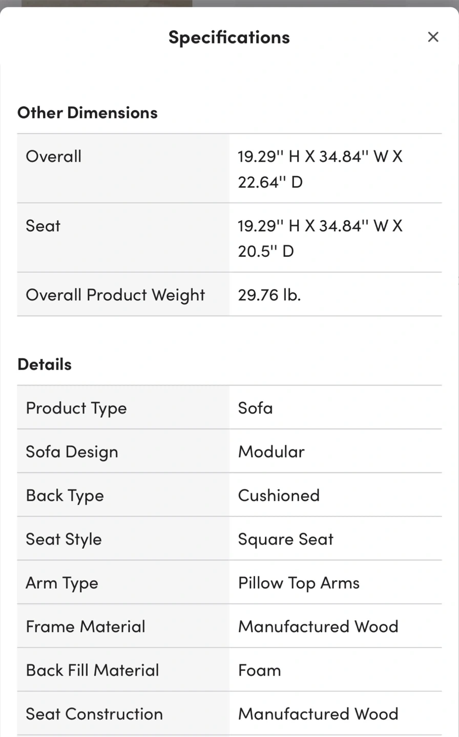 Add some comfort to your living space with this olive green modular sofa ottoman! It features a square seat and pillow top arms for ultimate relaxation. The frame is made of manufactured wood, and the back is filled with foam. Dimensions are 19.29" H x 34.84" W x 22.64" D.