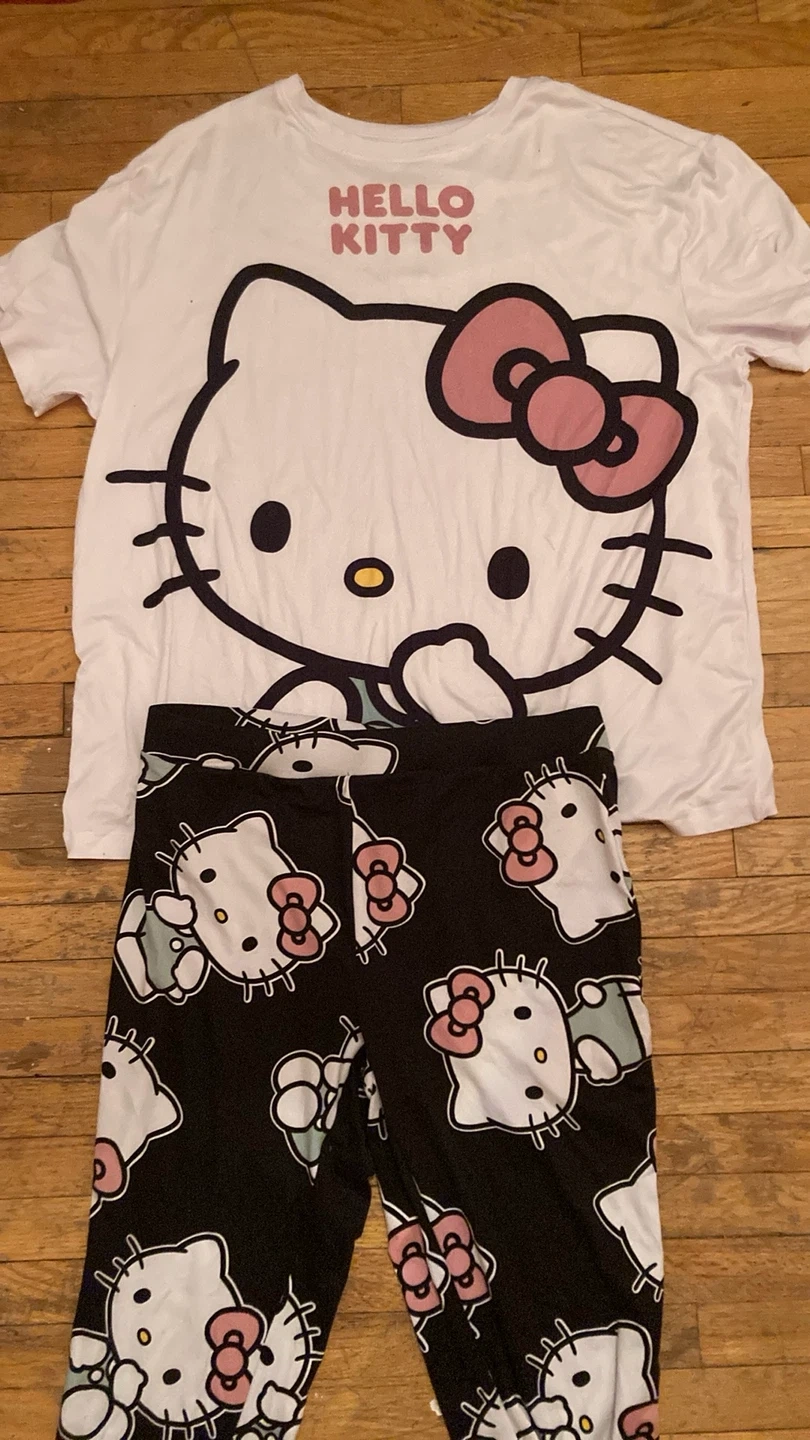 Super cute Hello Kitty pajama set in size M/M! The top is white with a large Hello Kitty graphic, and the bottoms are black with a Hello Kitty print. Both are made of a soft and comfy blend of polyester and spandex. Perfect for a cozy night in! And honestly it has a nice stretch for it too
