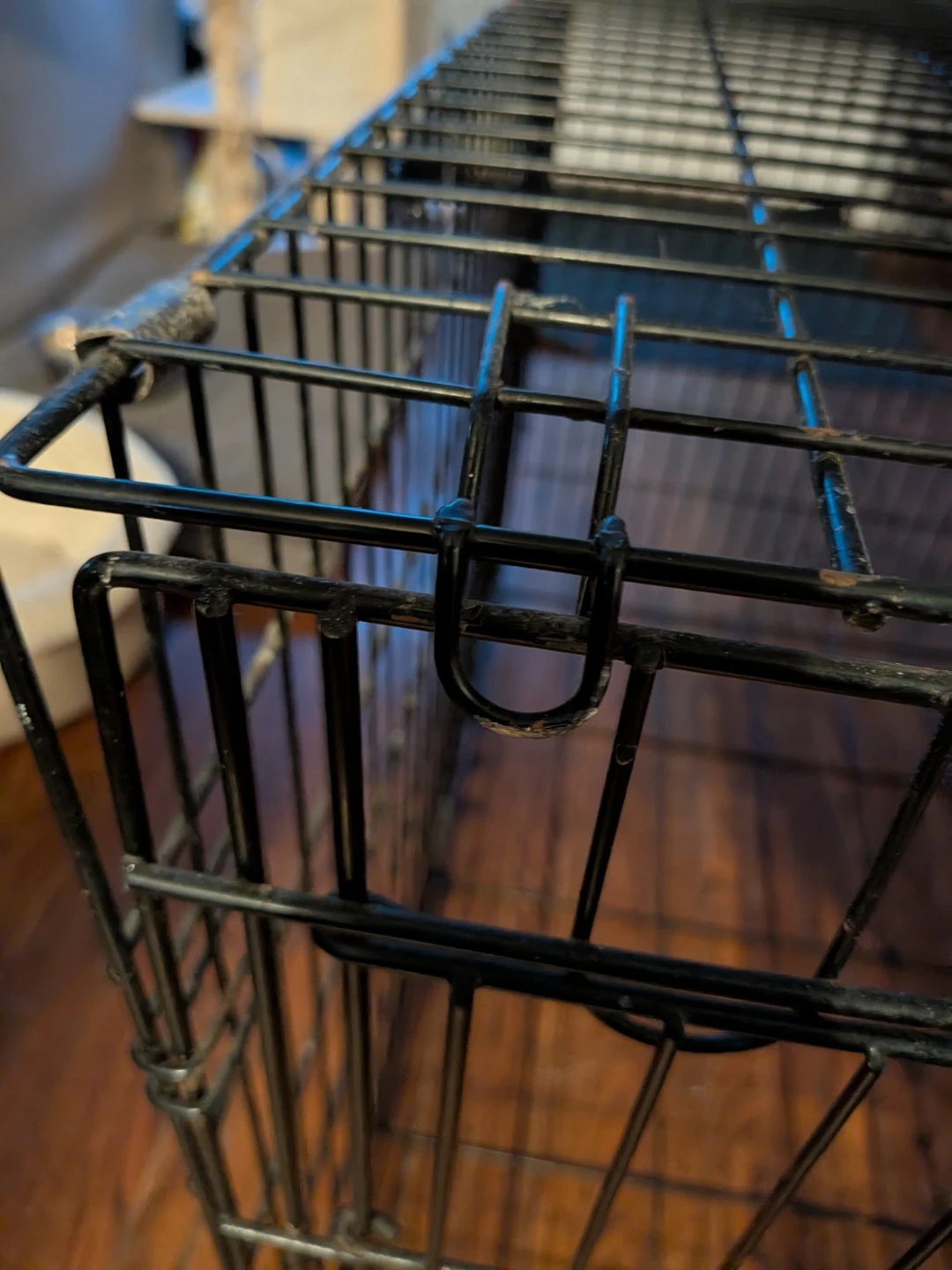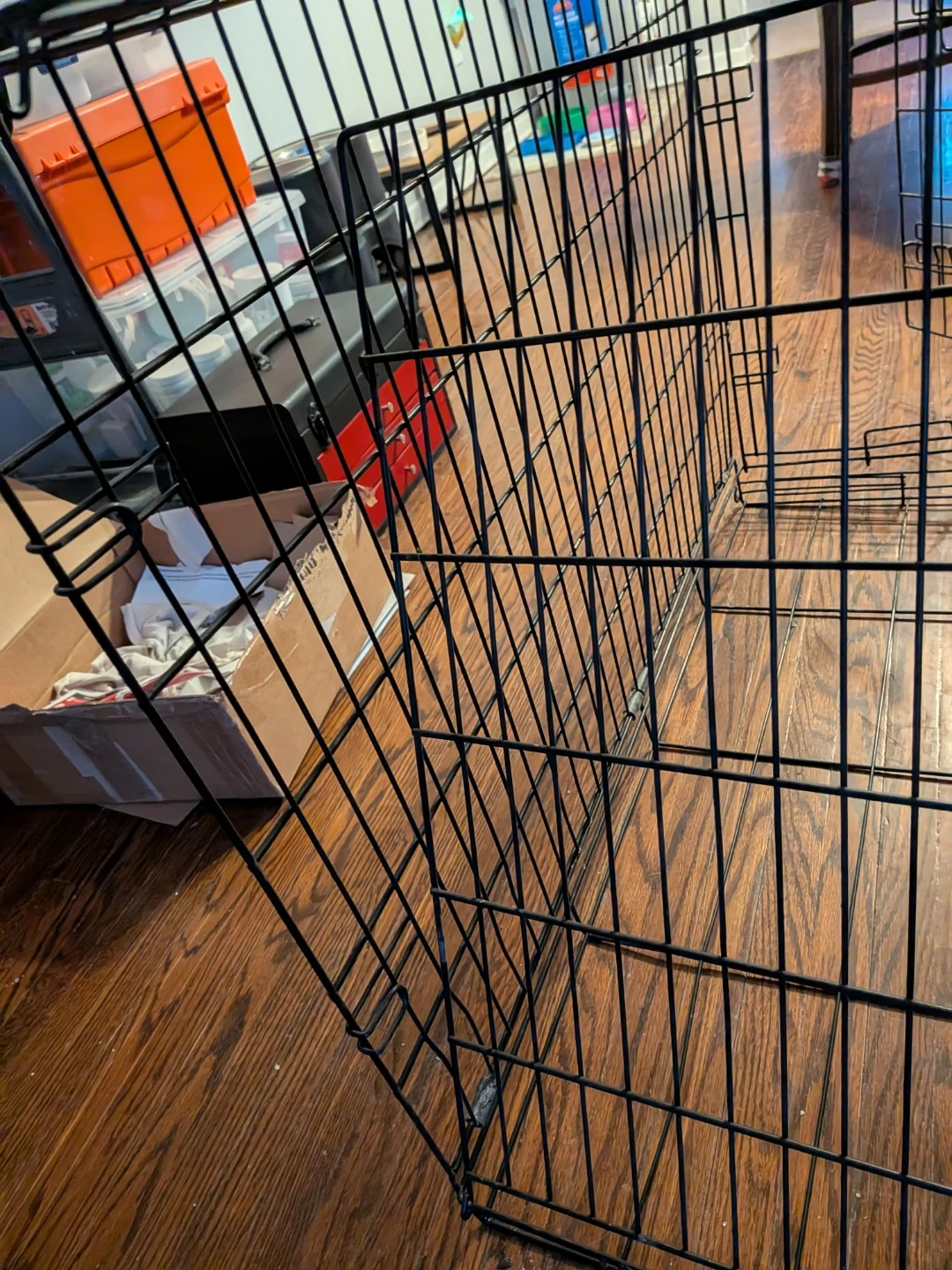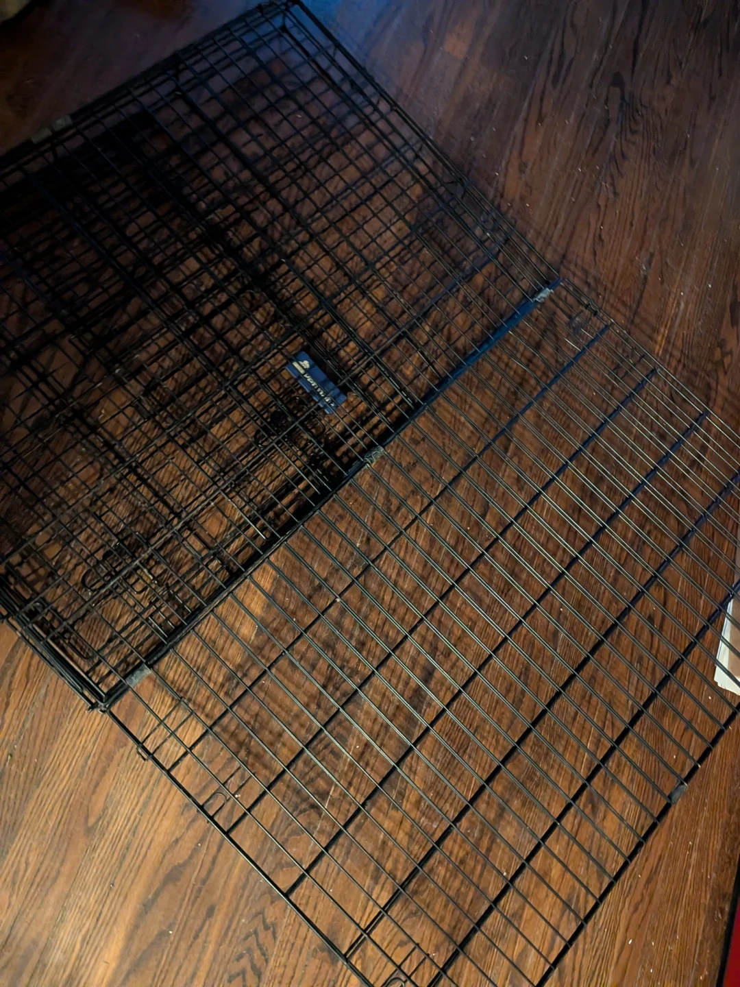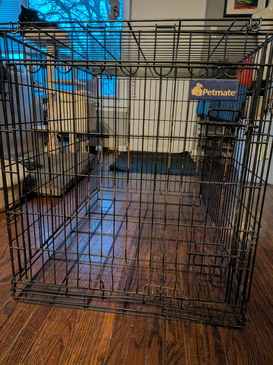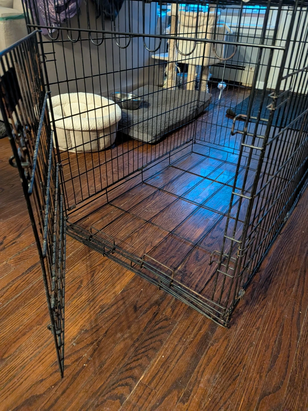 Selling a Petmate dog crate 3fet x 2 feet. It's a sturdy and reliable crate, perfect for training or travel. The door opens easily, and it folds down for convenient storage when not in use. It does show some signs of use, with metal patina. but is still perfectly functional. Good for small animals, not recommended for large dog breeds