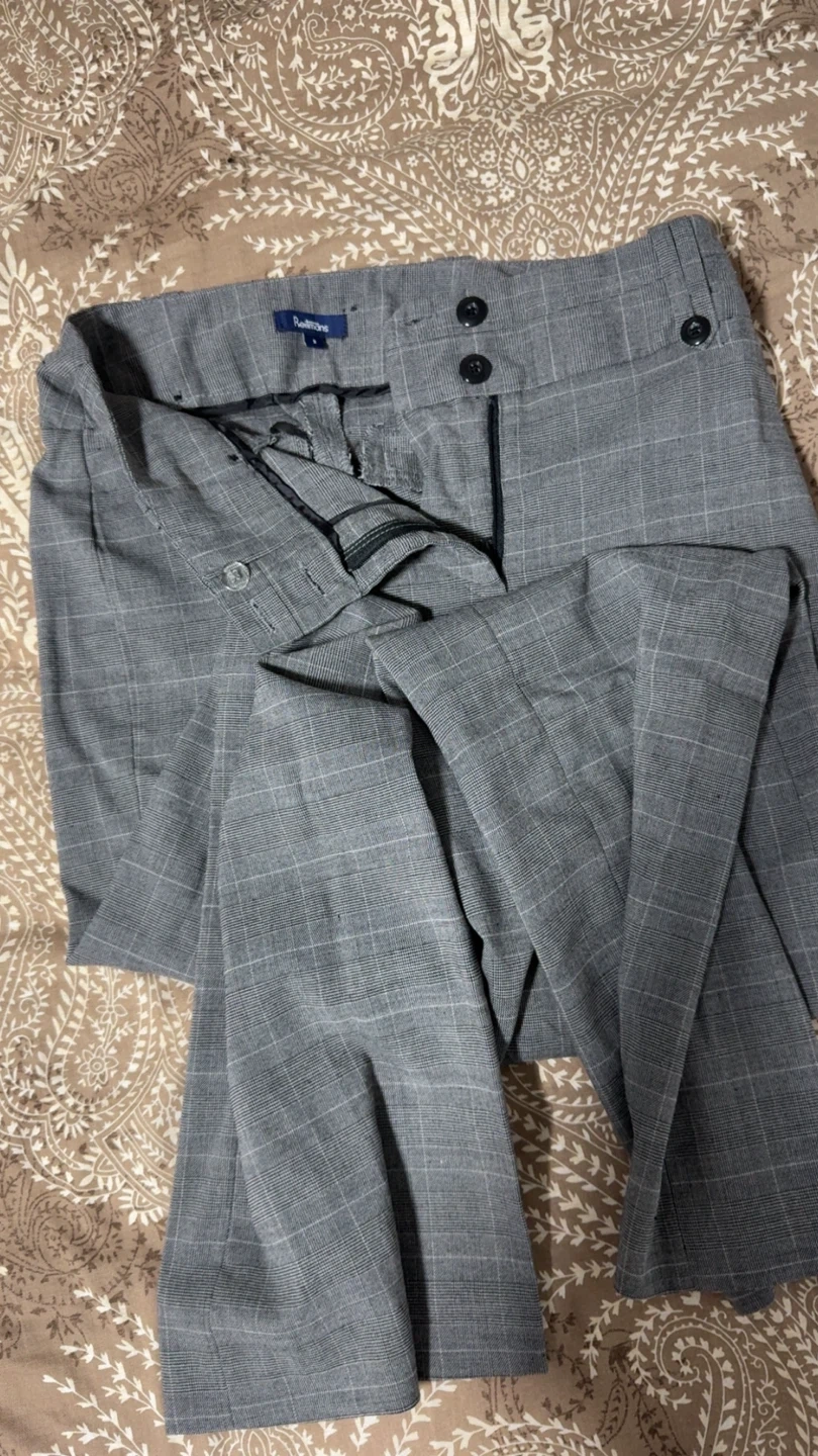 Selling a pair of Reitmans pants in a grey plaid pattern. They are a size 4 and in great condition!