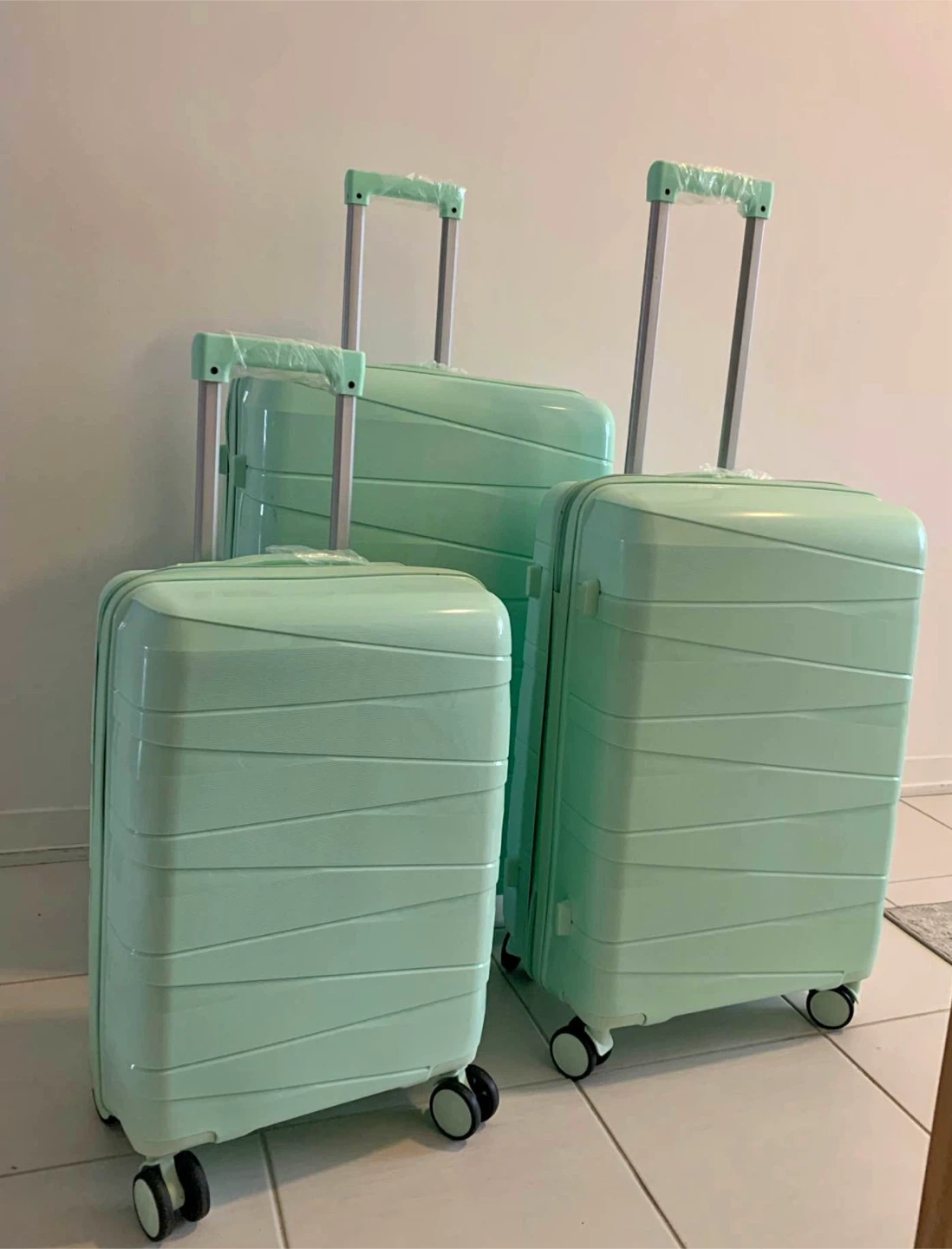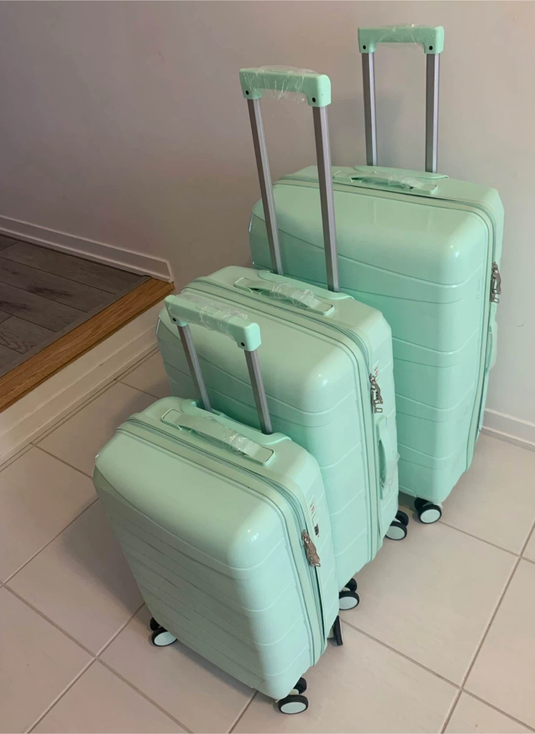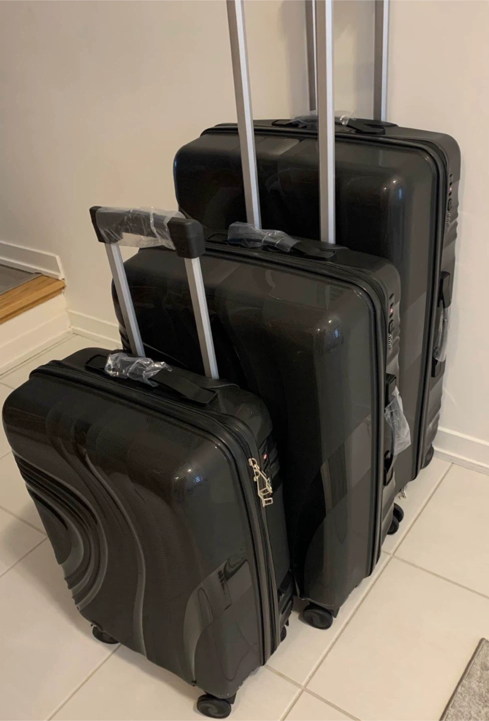 Selling a set of 3 hardside suitcases. They come in varying sizes and are perfect for all your travel needs! The set includes a small, medium, and large suitcase. The color is black. light green and grey.size 38,24,20