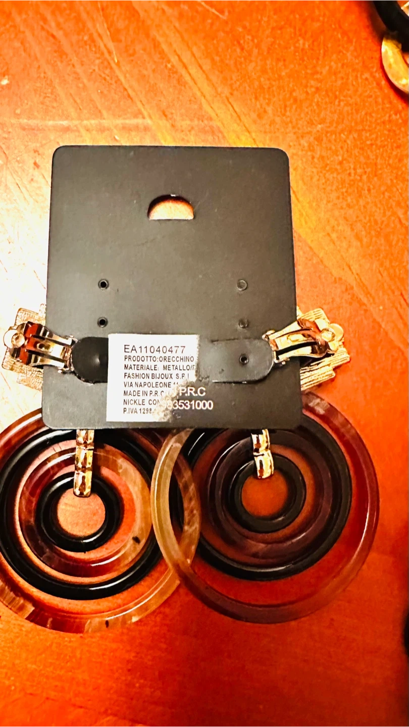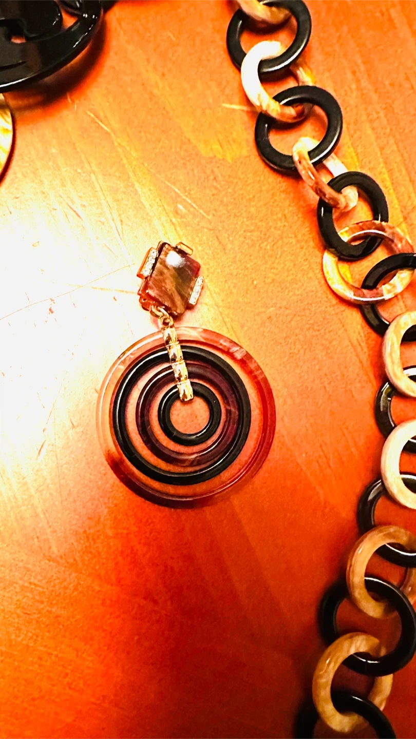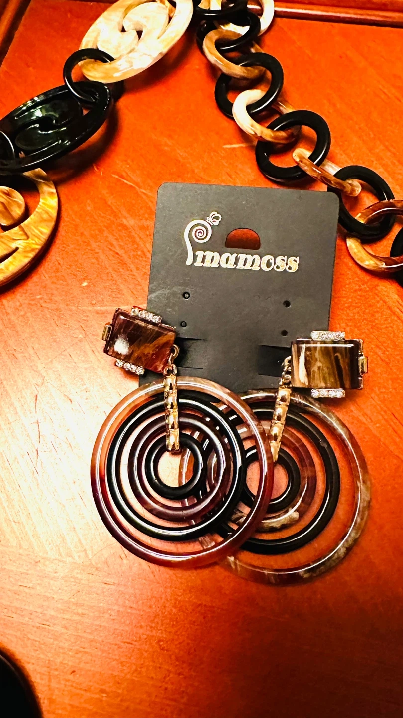 Here's a stylish necklace and earrings set from Linamoss! The necklace features a unique chain design with black and amber-colored links. The earrings have a cool, circular design with brown and black tones. Perfect for adding a touch of flair to any outfit