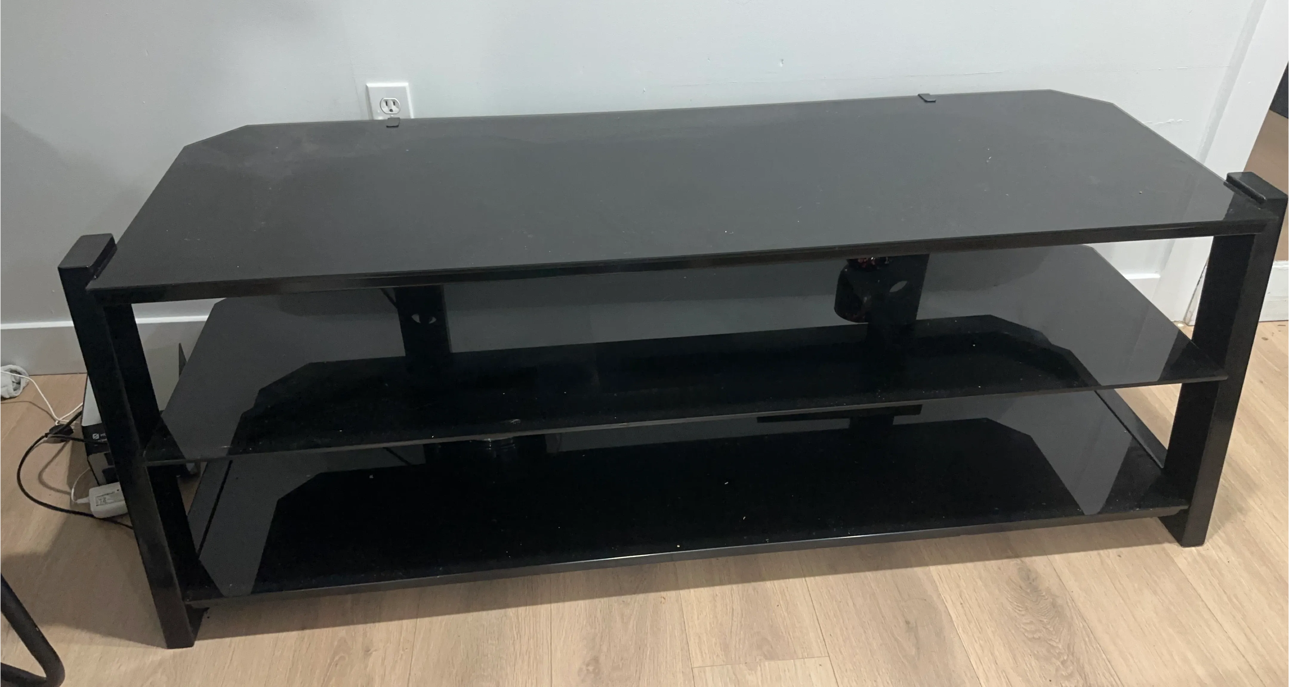 Selling a black glass TV stand. It has three shelves for ample storage. Great for organizing your media devices and accessories