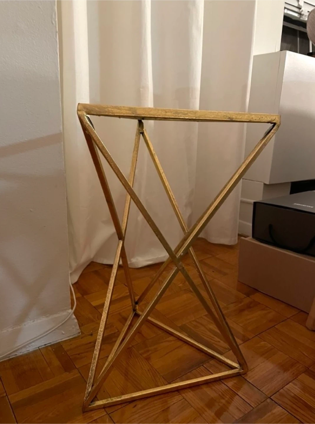 Selling a stylish gold metal side decor piece/tray holder ;It's in great condition and would look lovely in any living room or bedroom. Pretty much New condition! Pet free, cooking free, smoke free home!
