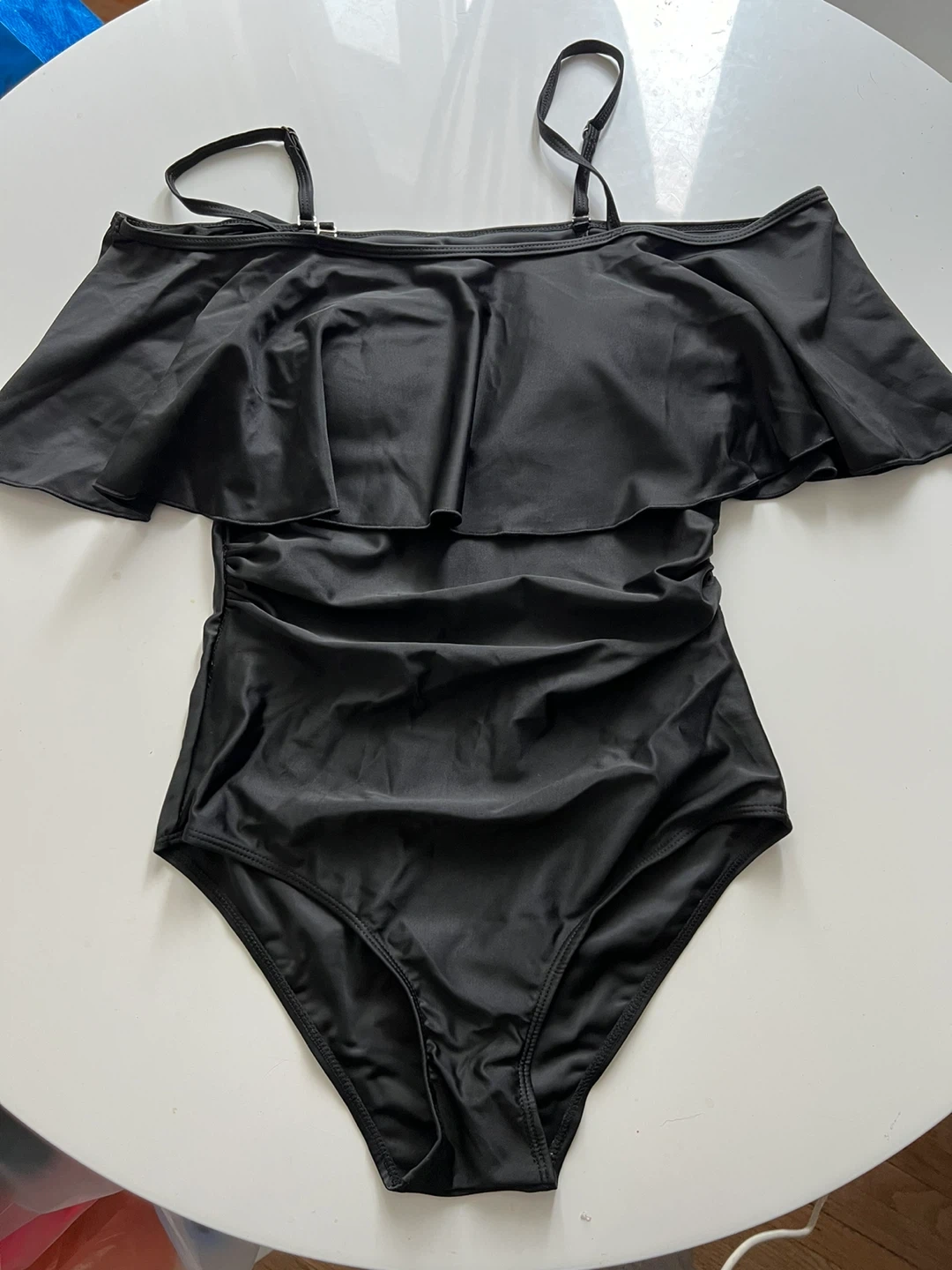 Selling a stylish black one-piece swimsuit. It features an off-the-shoulder design with adjustable straps. Perfect for the pool or beach!