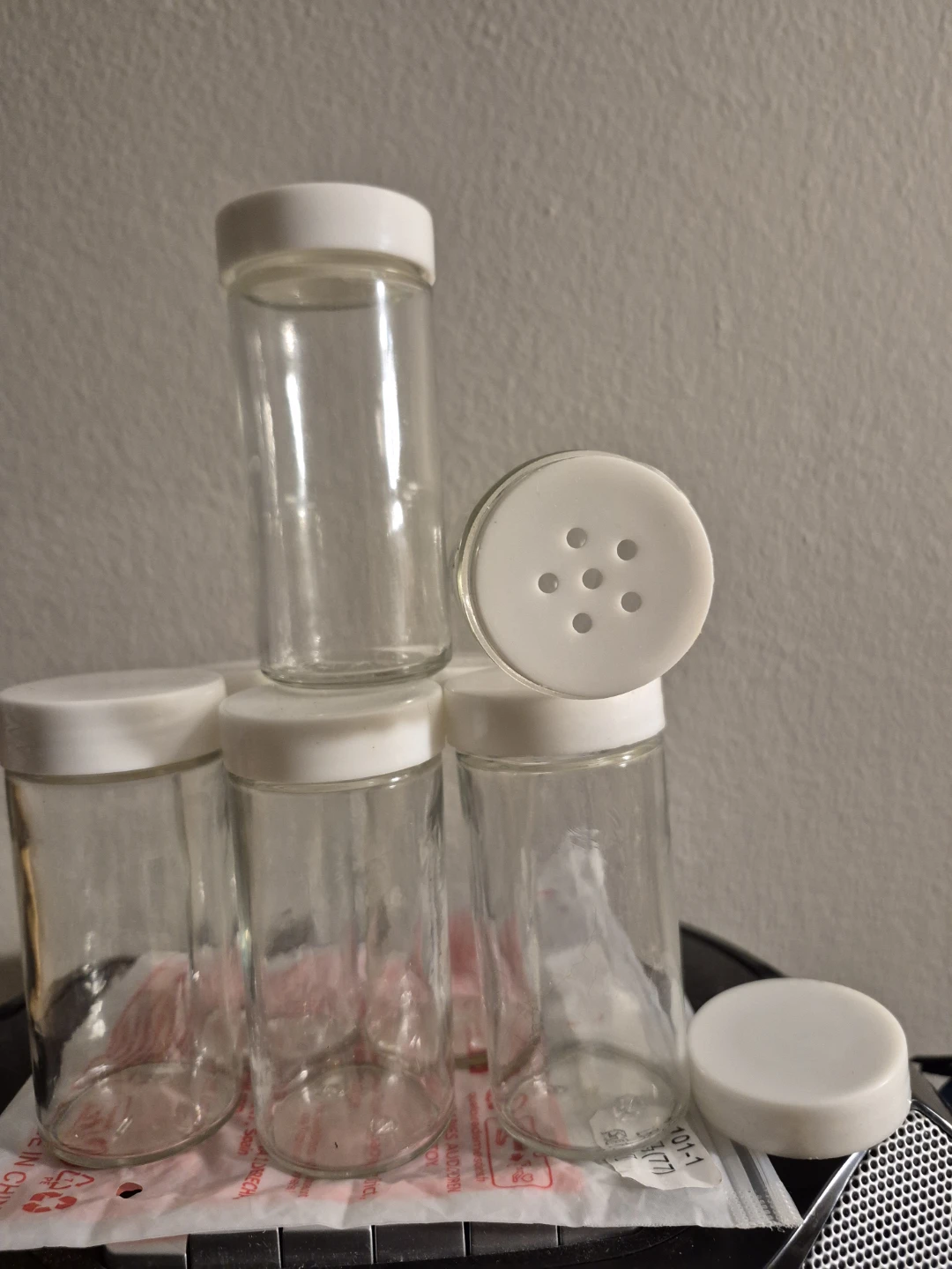 Selling a set of glass spice jars with white lids! They're in great condition and ready to organize your spices or other small items in the kitchen or pantry.