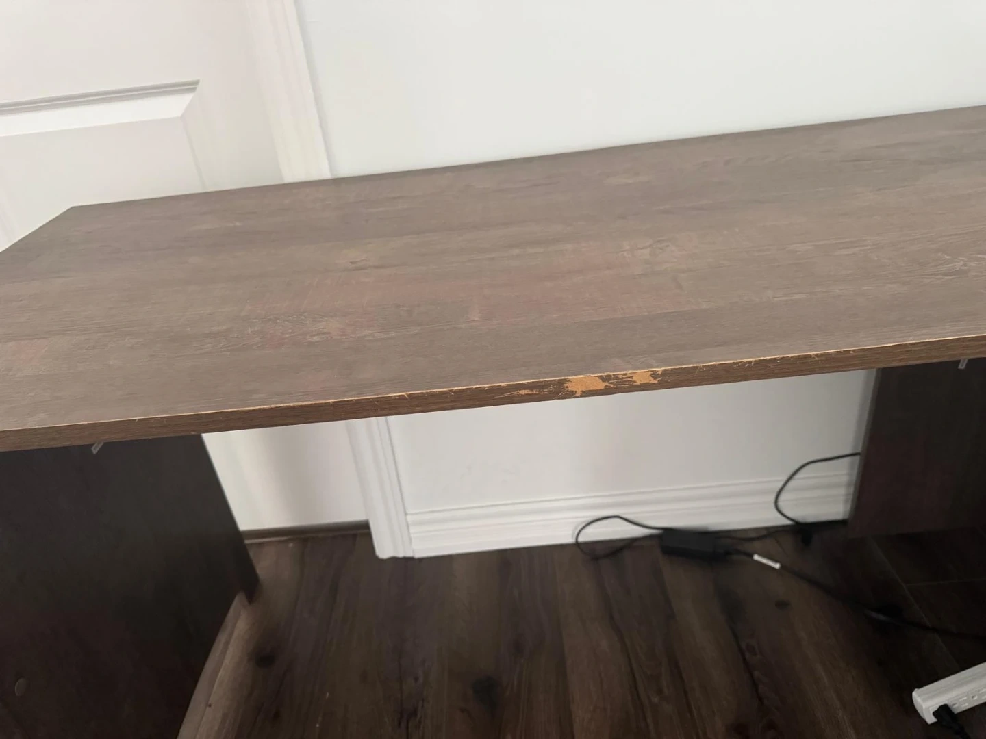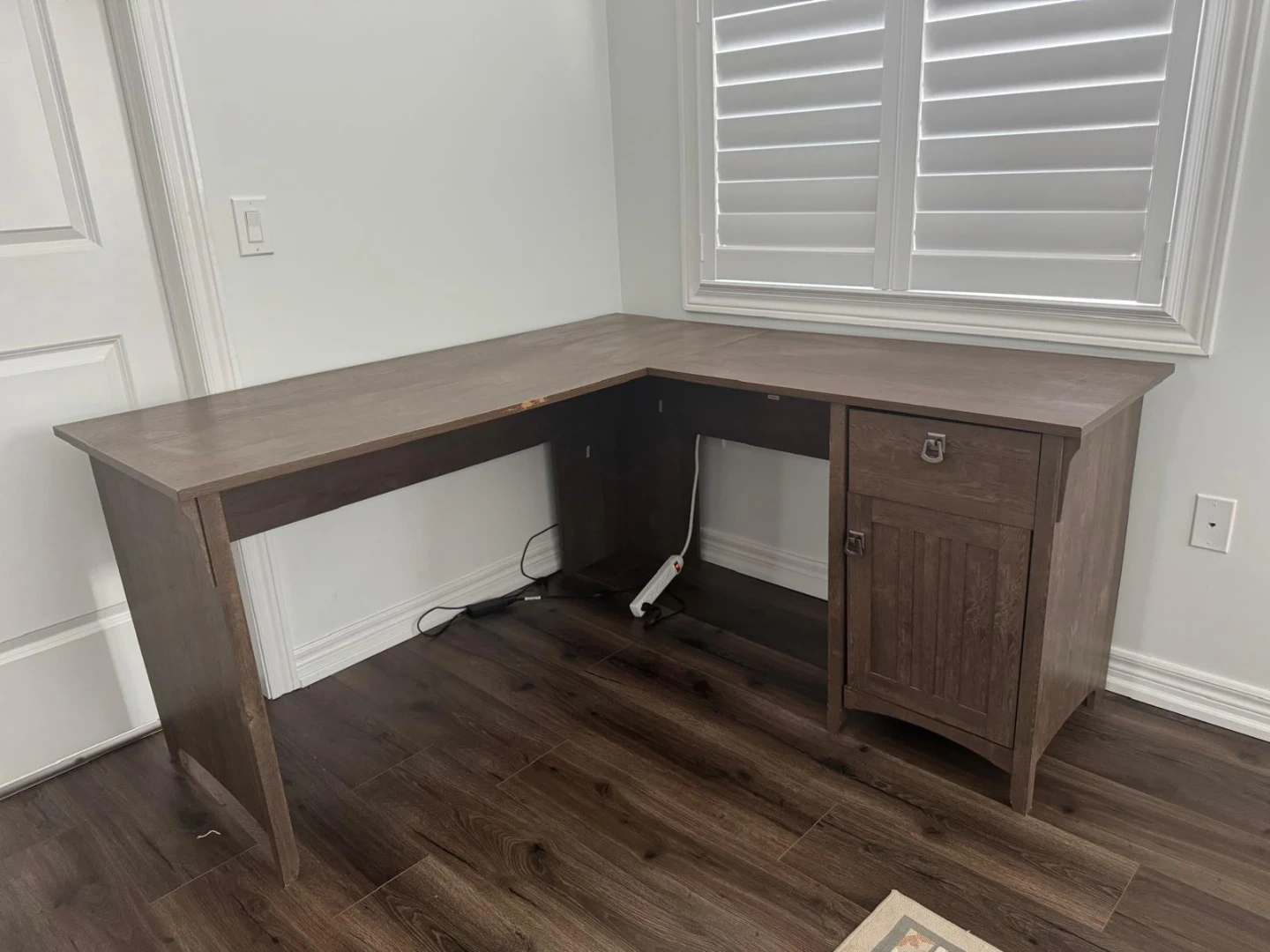 Selling a Bush Salinas L-Shape desk with storage. It's a great space-saving desk with a storage cabinet and adjustable shelf. It also has a utility drawer and open construction. Retails for $399.99. There is some wear on the edge of the desk as shown in the picture.