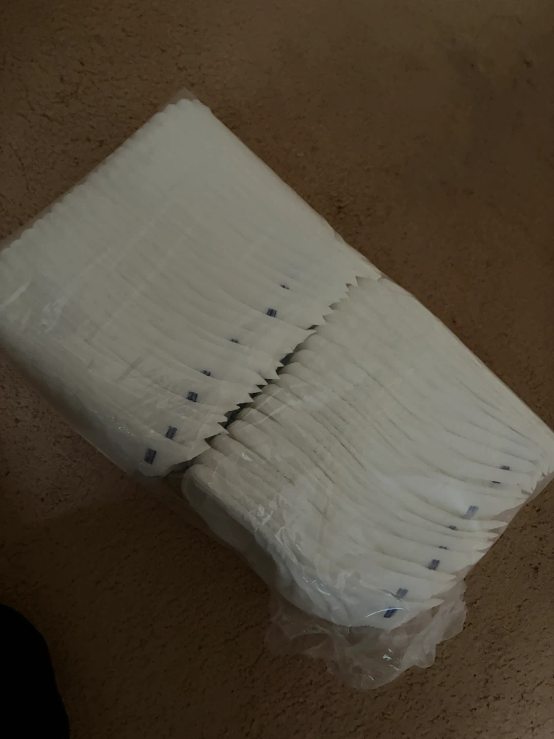 Open sleeve of size 1 Royale diapers. Only a few diapers have been taken out. Rest have always been stored in plastic packaging.