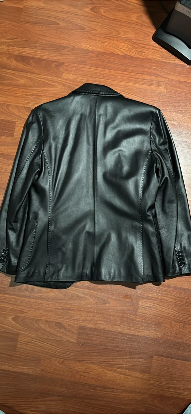 Selling a stylish black leather blazer from Codi Gallery. The interior has a unique grey pattern.