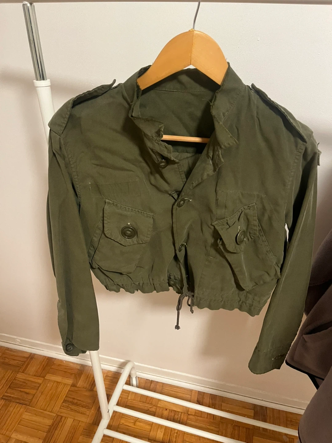 Selling an olive green cropped jacket. It features a button-up front and several pockets. The jacket has a drawstring at the bottom. It's in good condition and perfect for layering this is custom designed by me hand cut. This is original Canadian army gear.