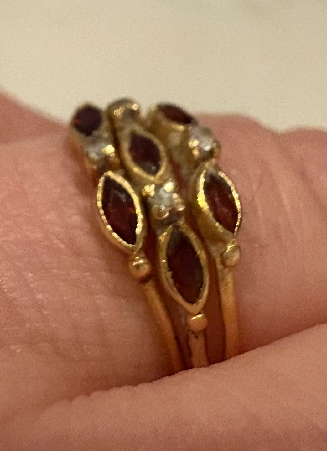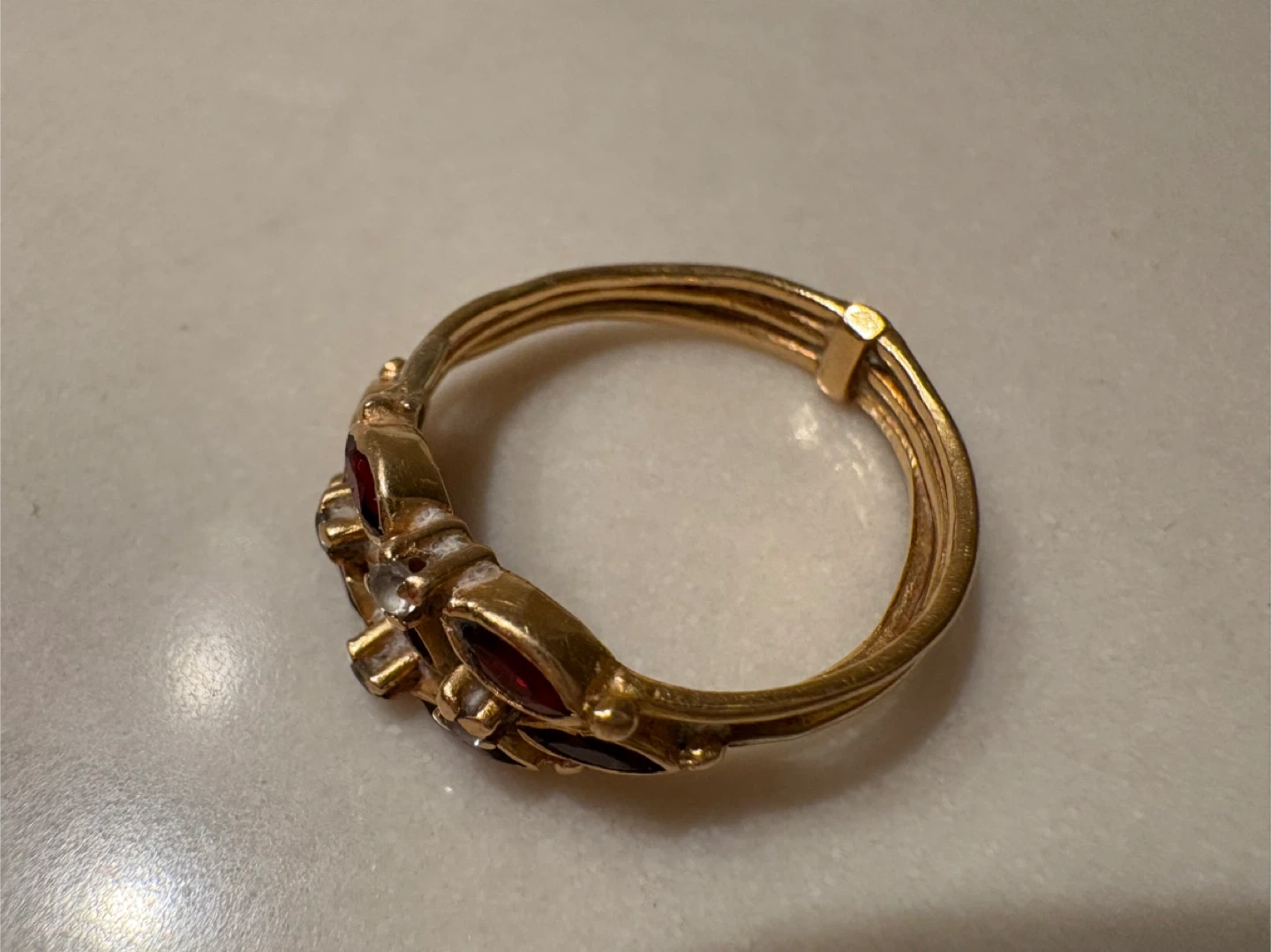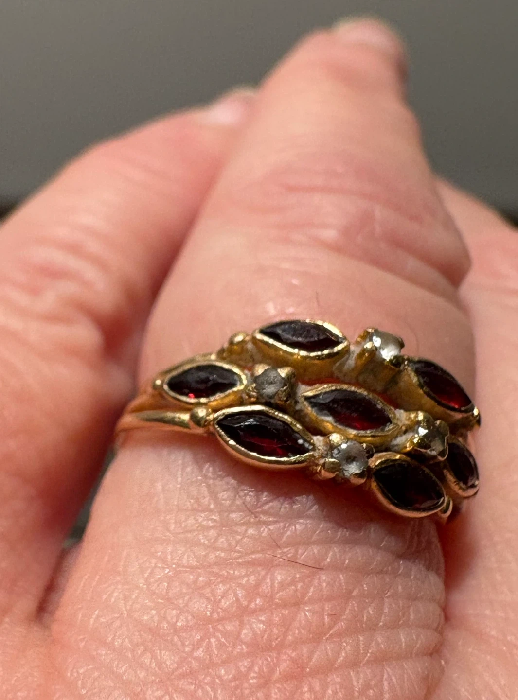 Vintage EU 19.2 K Portuguese Gold, Garnet & Diamond Multiband Women's Ring Size 7 - 7.25