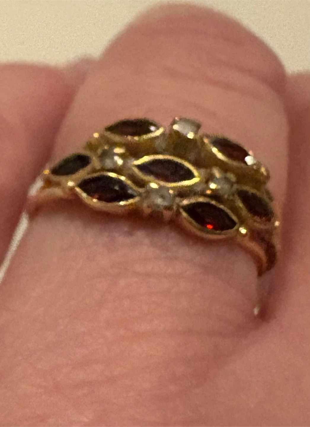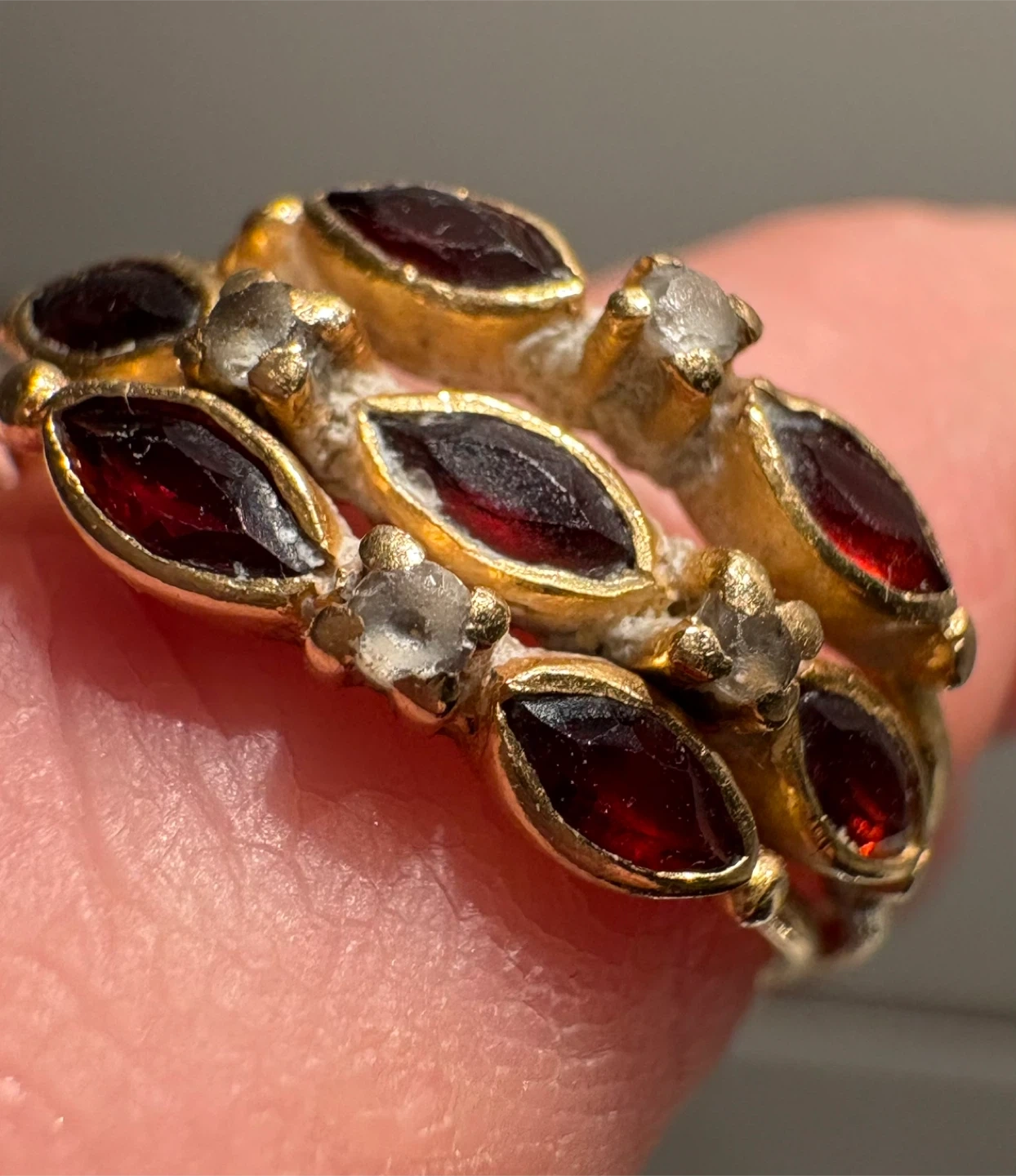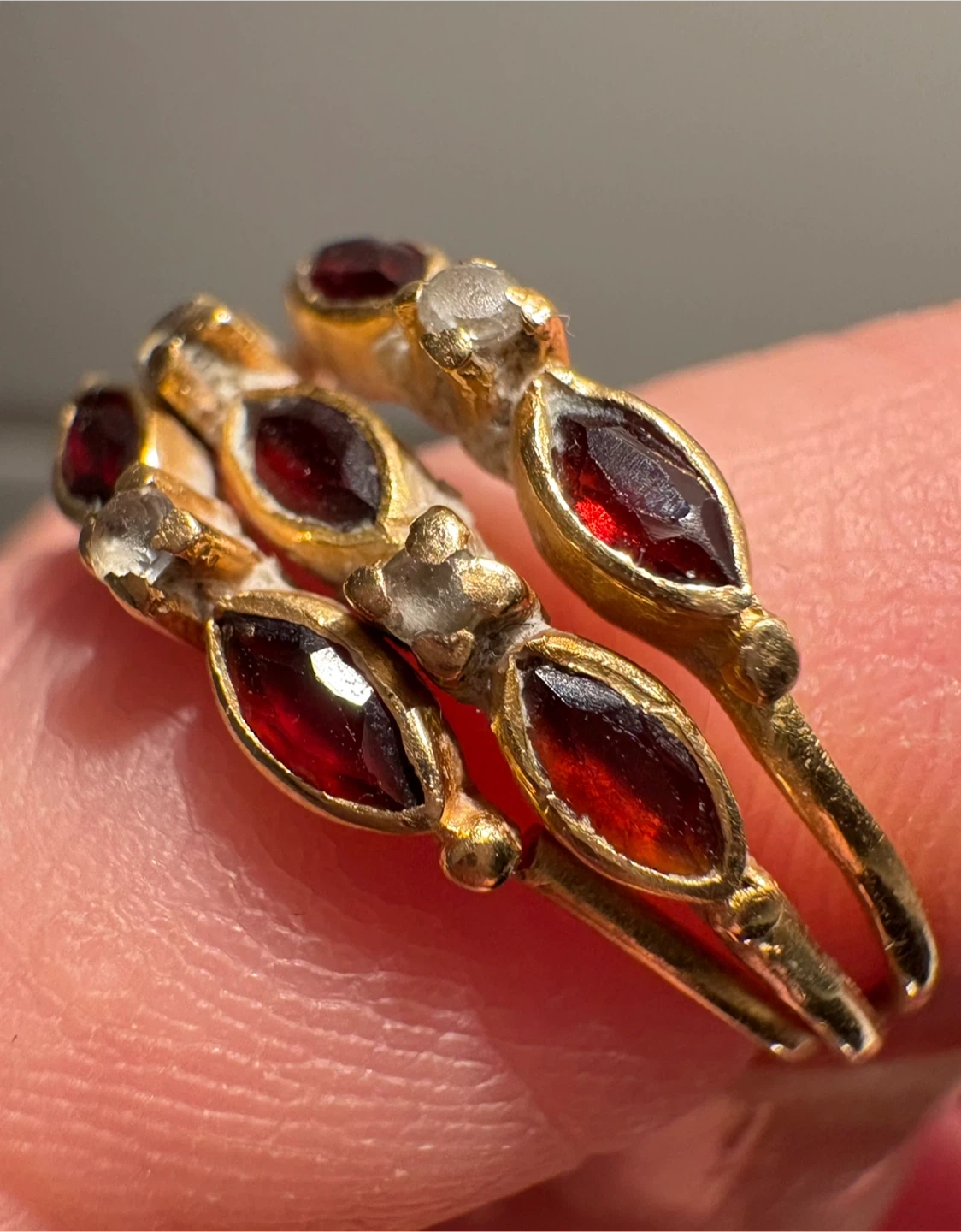 Vintage EU 19.2 K Portuguese Gold, Garnet & Diamond Multiband Women's Ring Size 7 - 7.25