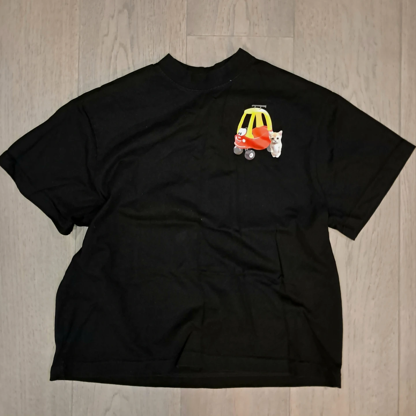 Boxy shape (S, M, L sizes are available), 220gsm, comes in black and white.