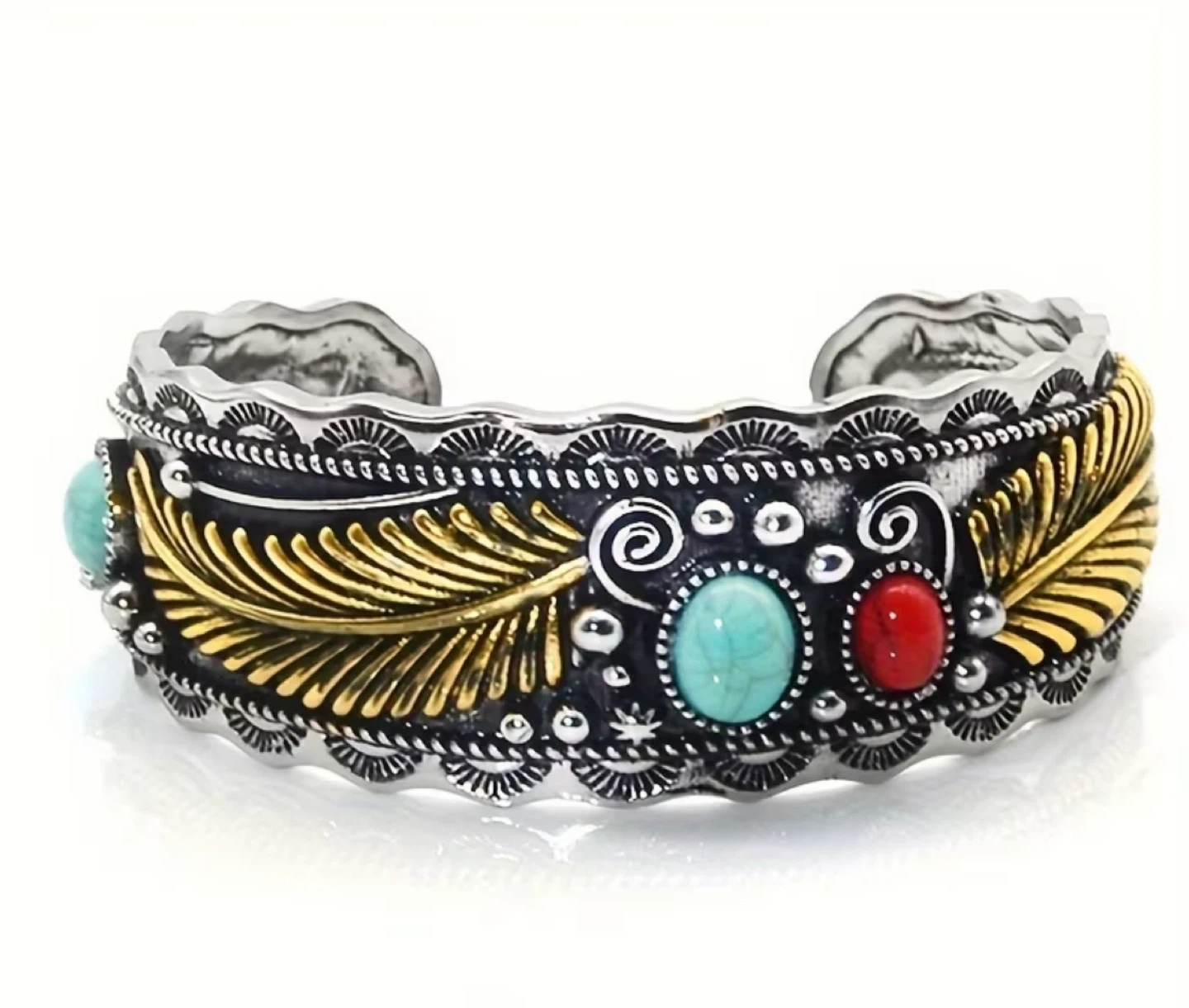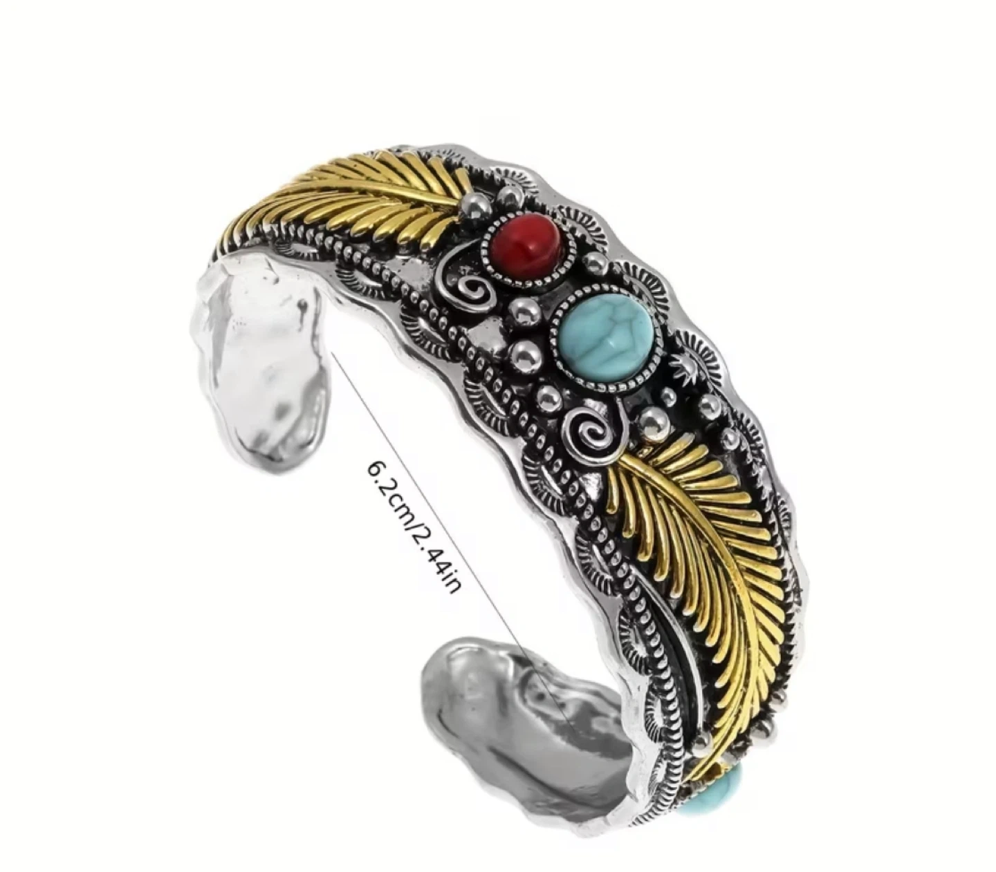 Selling a beautiful boho-style cuff bracelet! It features a silver-tone metal with gold-tone feather accents and turquoise and coral coloured stones. The bracelet is 6.2cm (2.44in) in diameter. A unique piece to add to your collection!