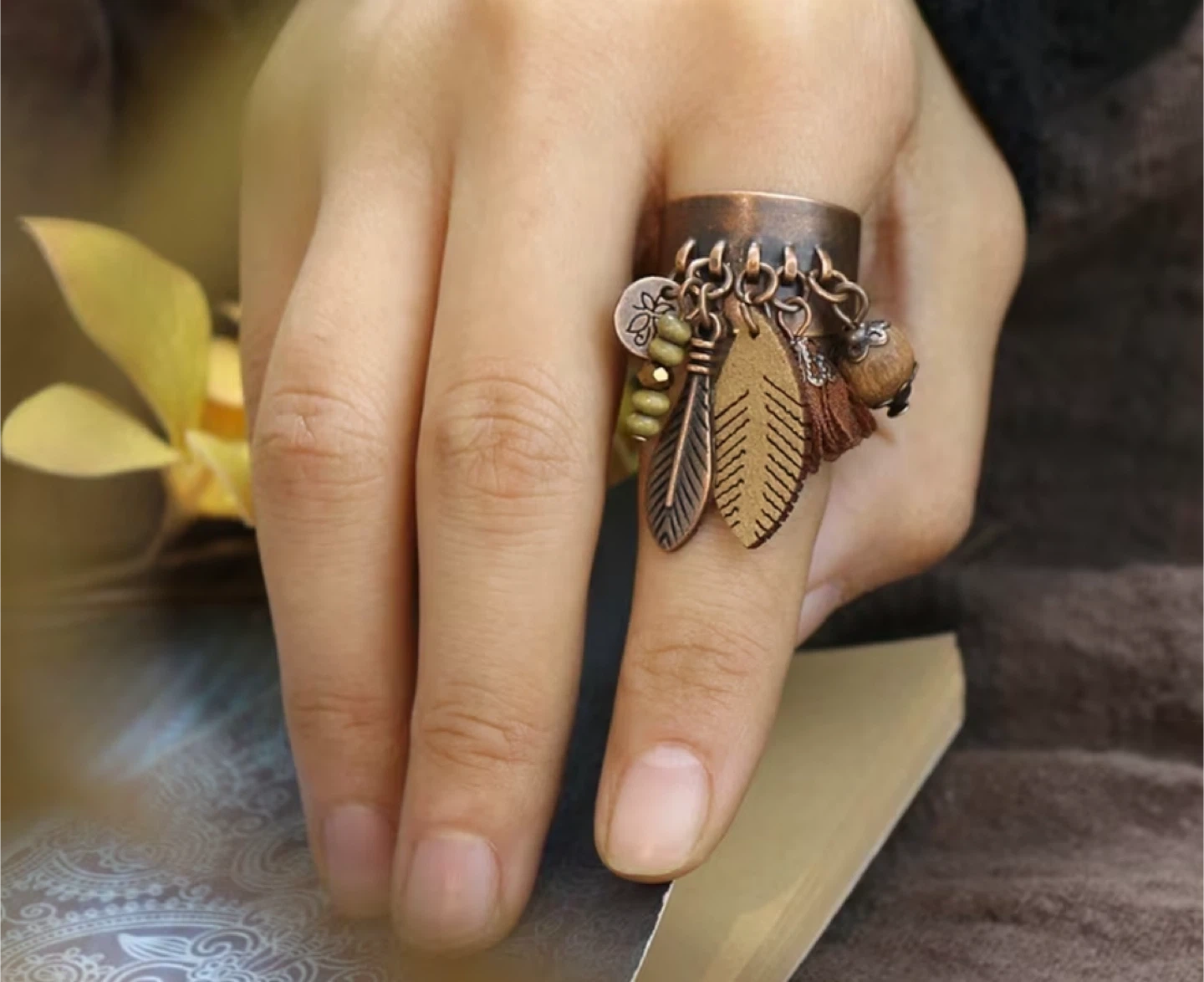 Check out this unique boho-style ring! It features an adjustable band in a copper tone, adorned with various charms including feathers, beads, and a tassel. A great statement piece to add some flair to any outfit