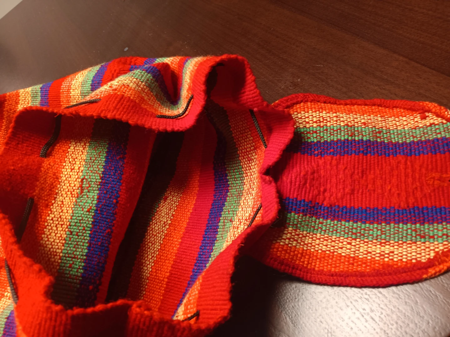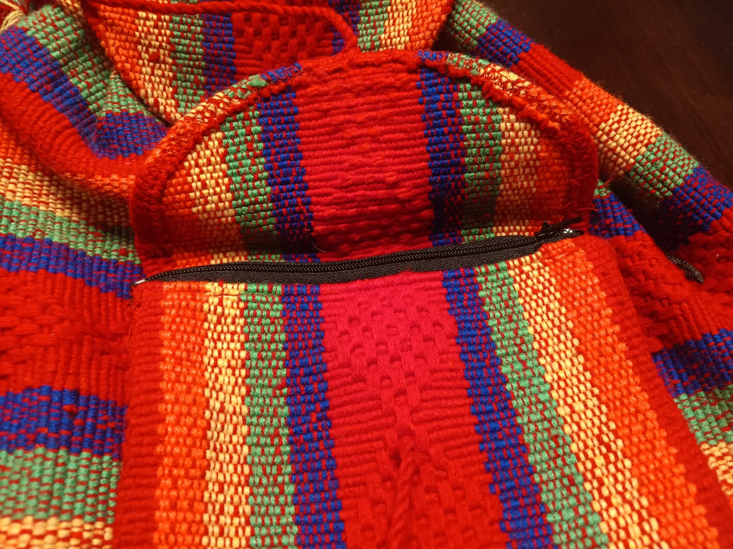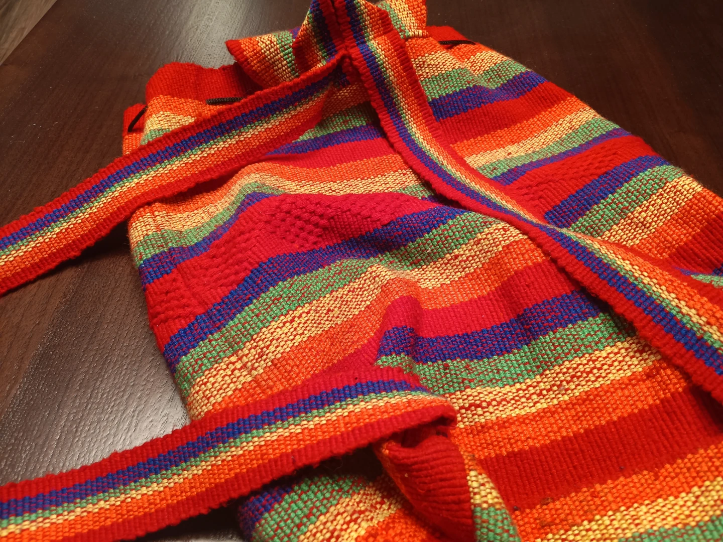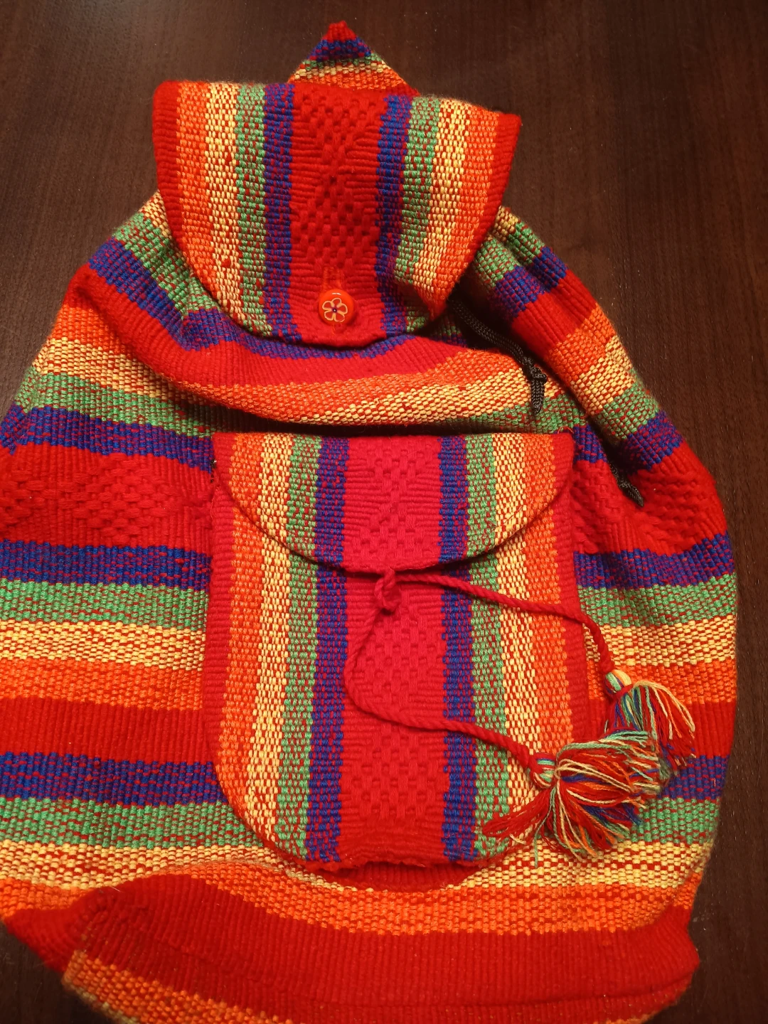 This is a colorful striped woven backpack! It features a front pocket with a drawstring closure and a top flap with a button closure. The backpack has adjustable straps for a comfortable fit