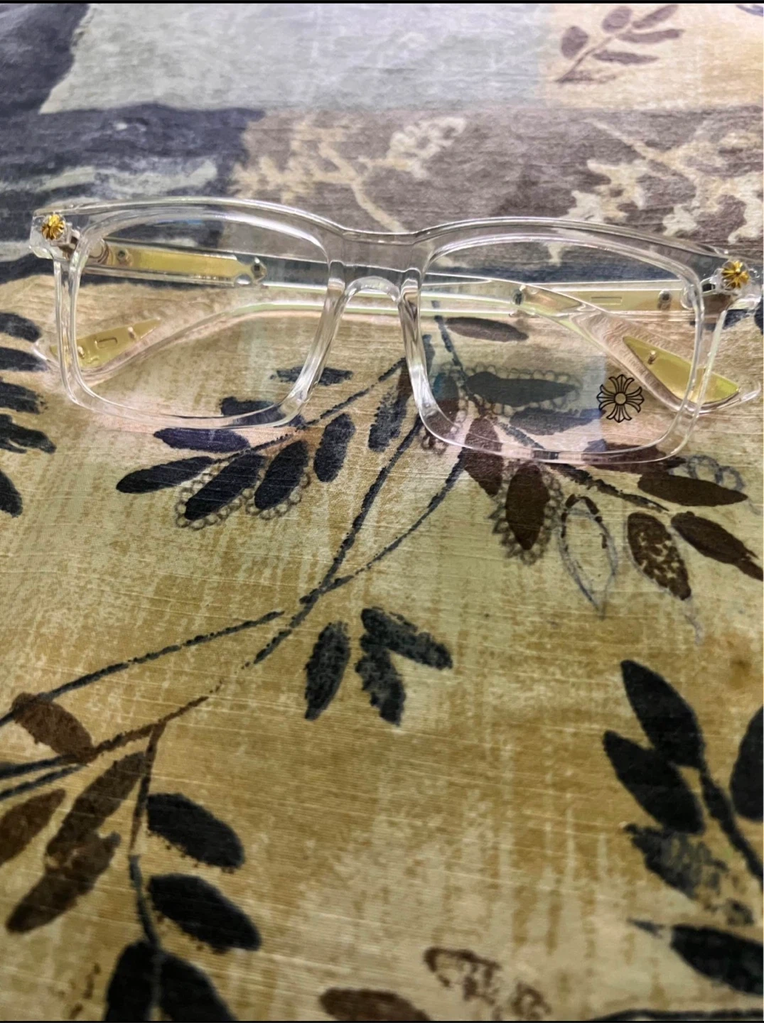 Selling a pair of Chrome Hearts eyeglasses with a clear frame. They feature the signature Chrome Hearts floral design on the sides. Anti-blue light lenses